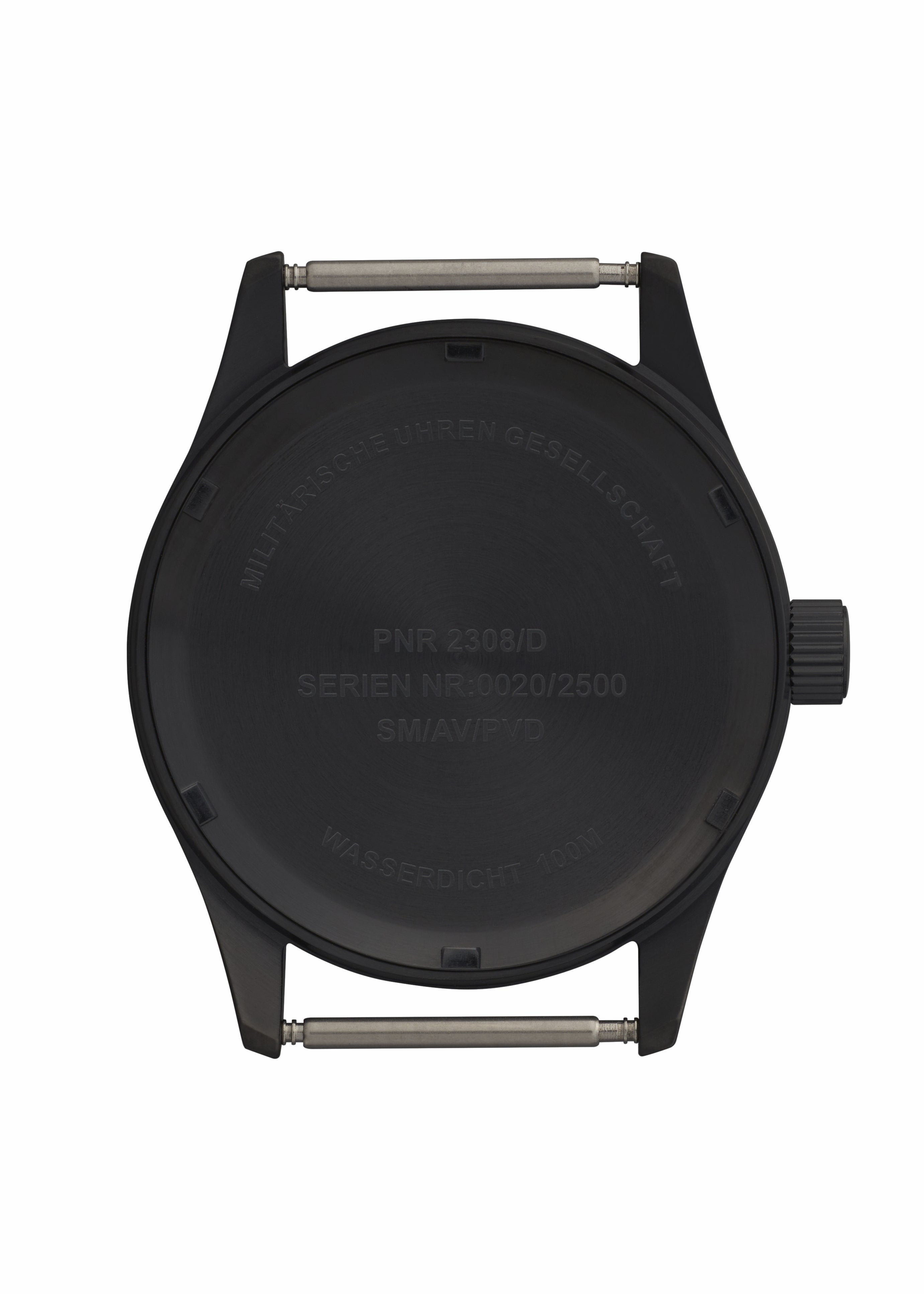 This MWC Classic Aviator model is built for durability and precision. It features a covert black, non-reflective stainless steel case with a screw-down crown and case back, ensuring 100m water resistance.