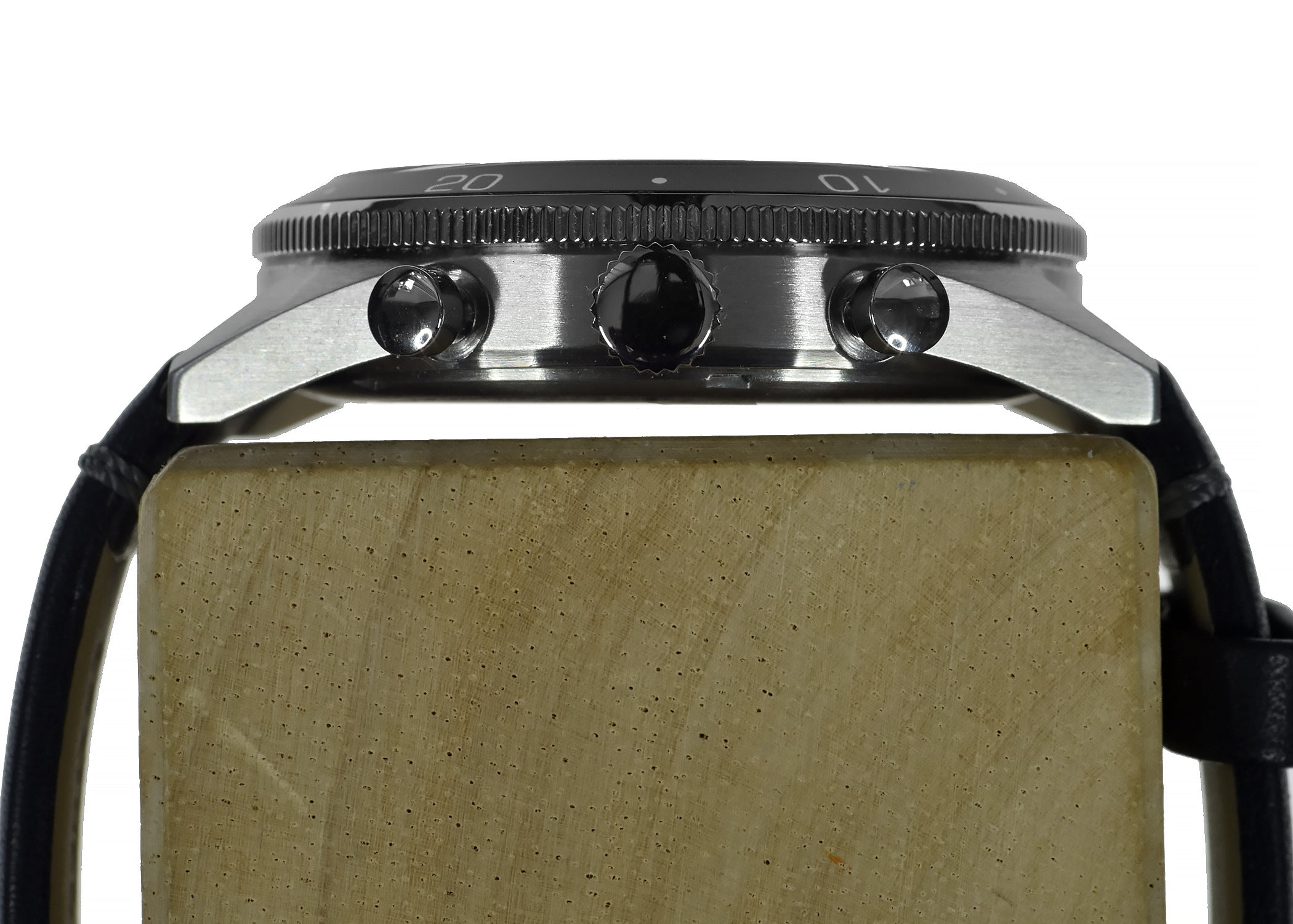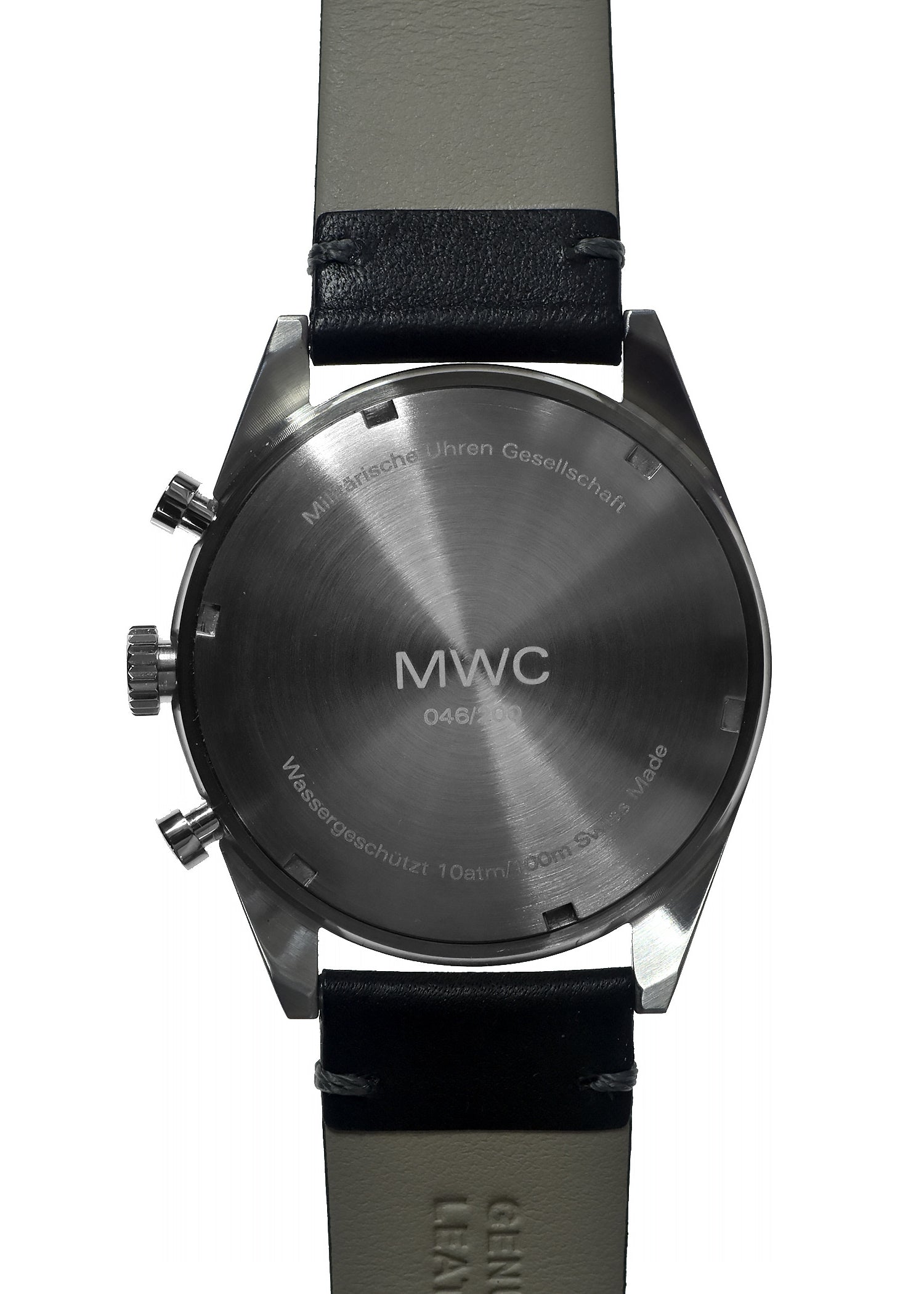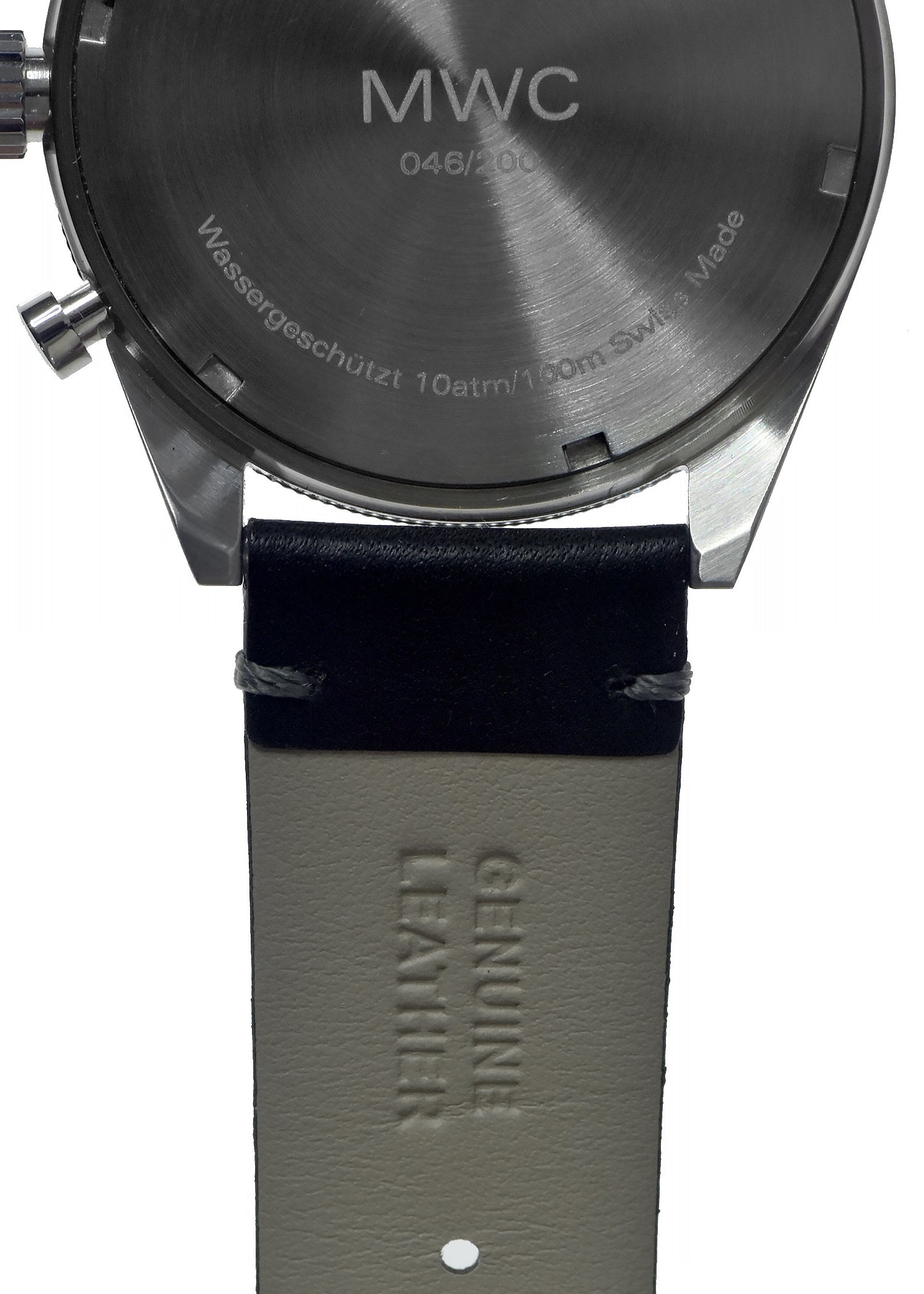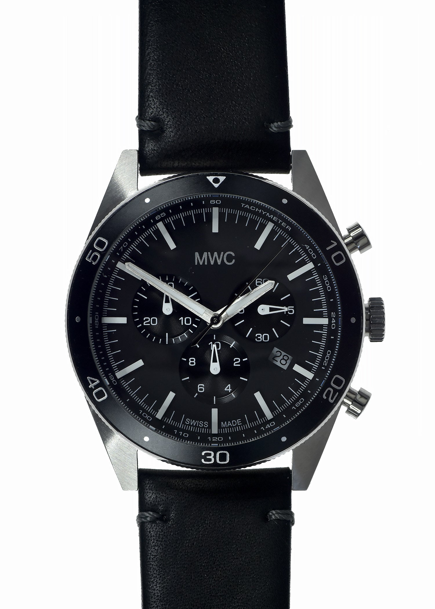 The MWC Swiss Airline pilots chronograph stainless steel case is 100m (330ft) water-resistant and 100% Swiss Made. The watch is made to a specification that is specifically designed to meet the needs of civilian airline pilots and aircrew and is ideal for a diverse range of applications such as use by military or GA pilots. The actual case size is 42.5mm and the chronograph uses a high-performance 13 jewel Swiss Ronda 5040.D movement with over 4 years of battery life.