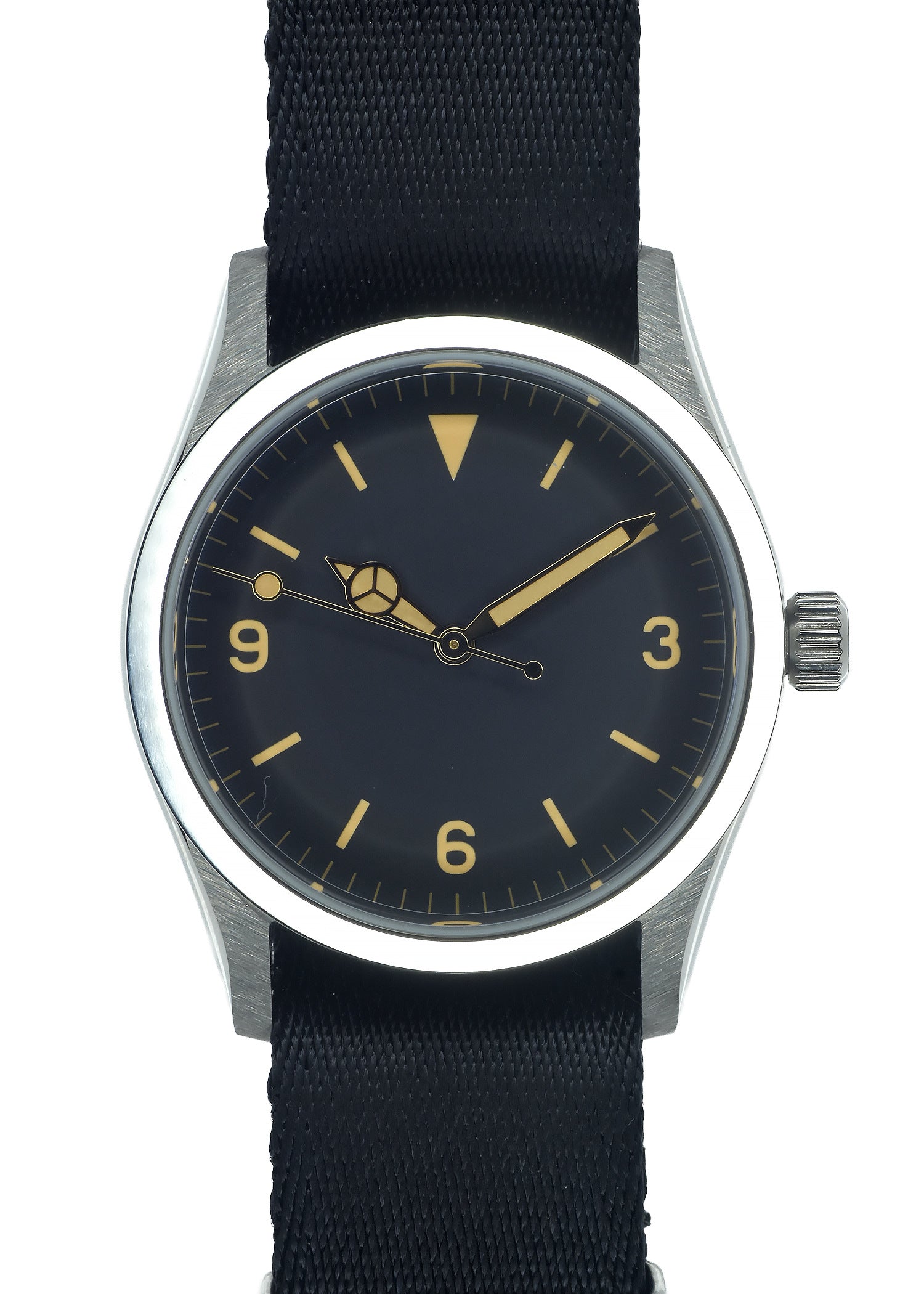 The watch uses Luminova instead of the Tritium that was used in the 1960s. The main advantage of Luminova is that it does not deteriorate with age and is non-radioactive. In this variant, the paint color mimics the appearance of aged Tritium paint.