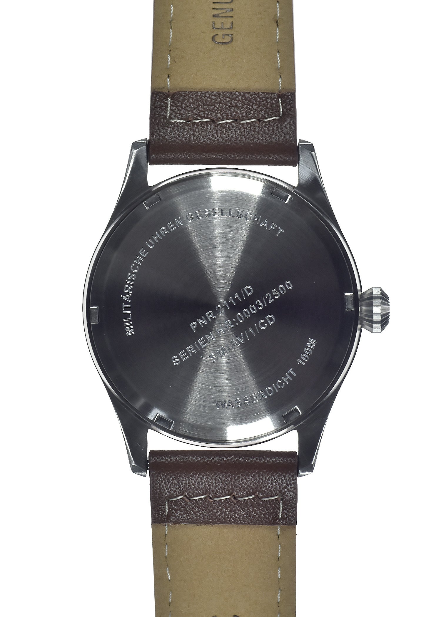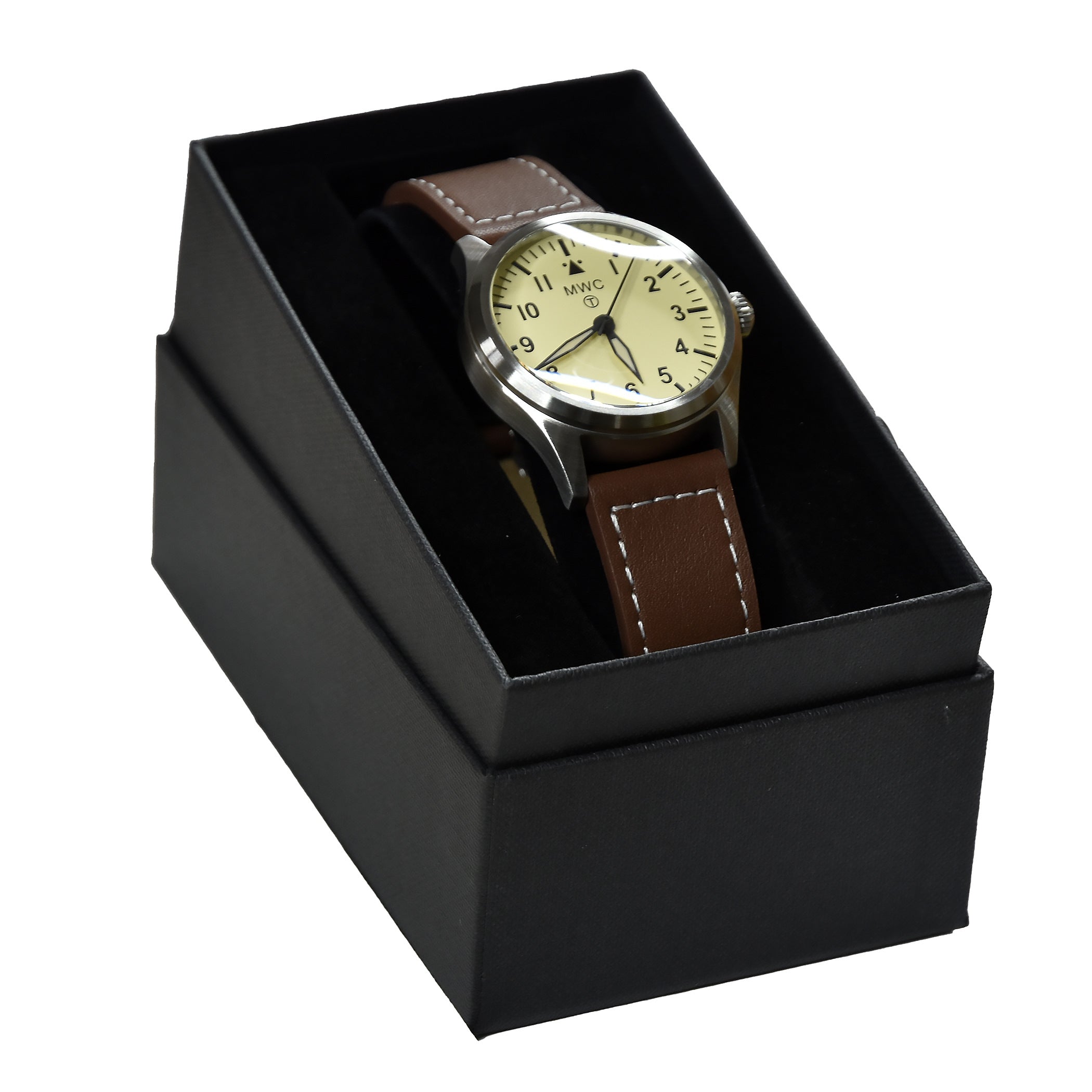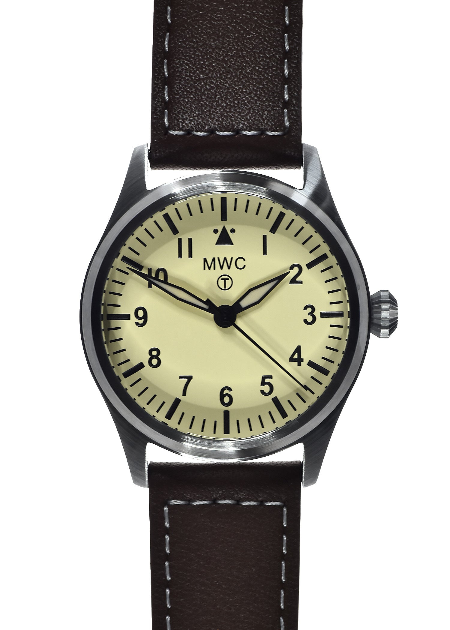 This MWC classic aviator model is 100m water resistant with a solid stainless steel case and screw-down crown and case back. The classic design and retro style crown combined with the low maintenance and highly accurate hybrid movement make this a unique and very desirable timepiece.
