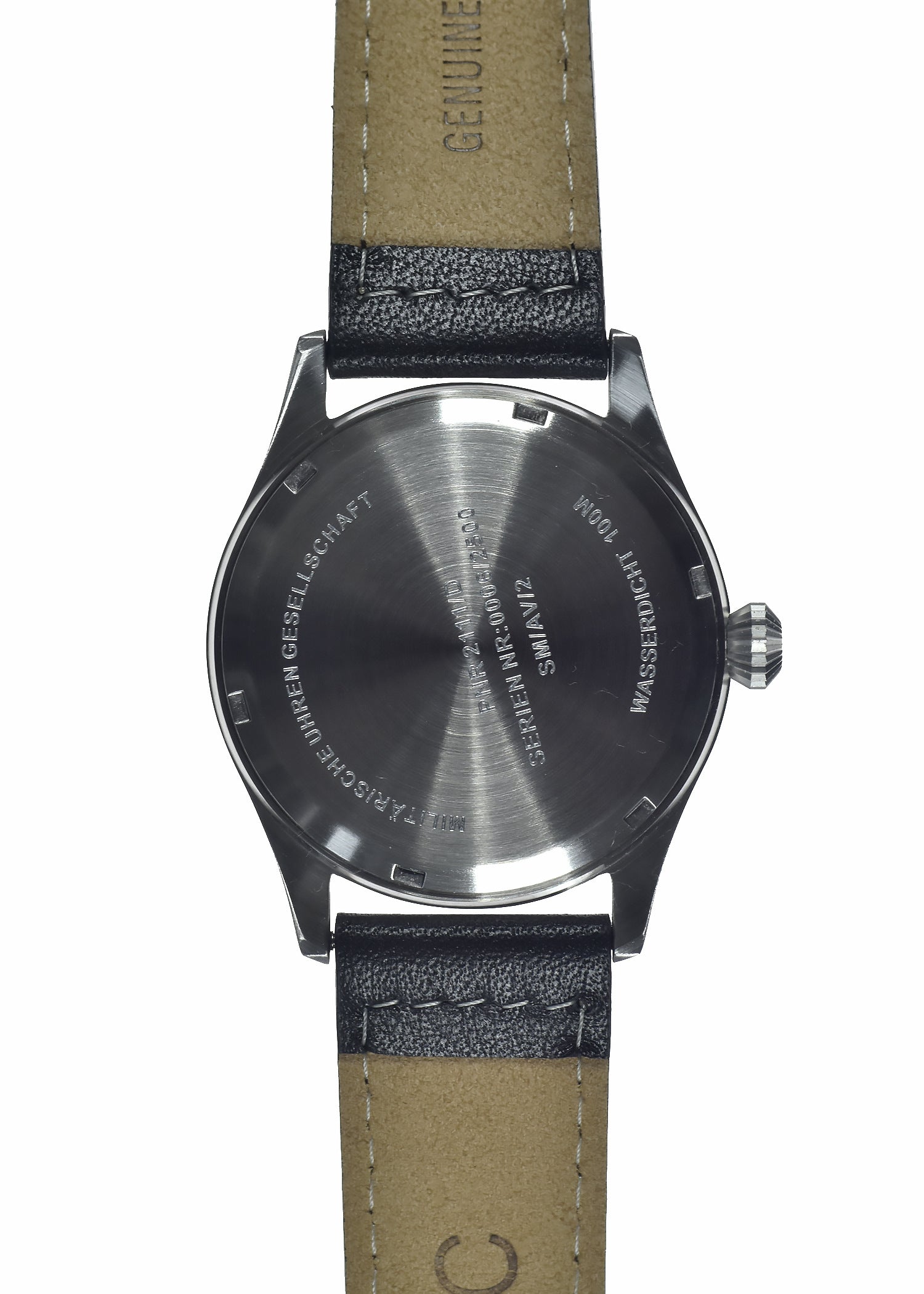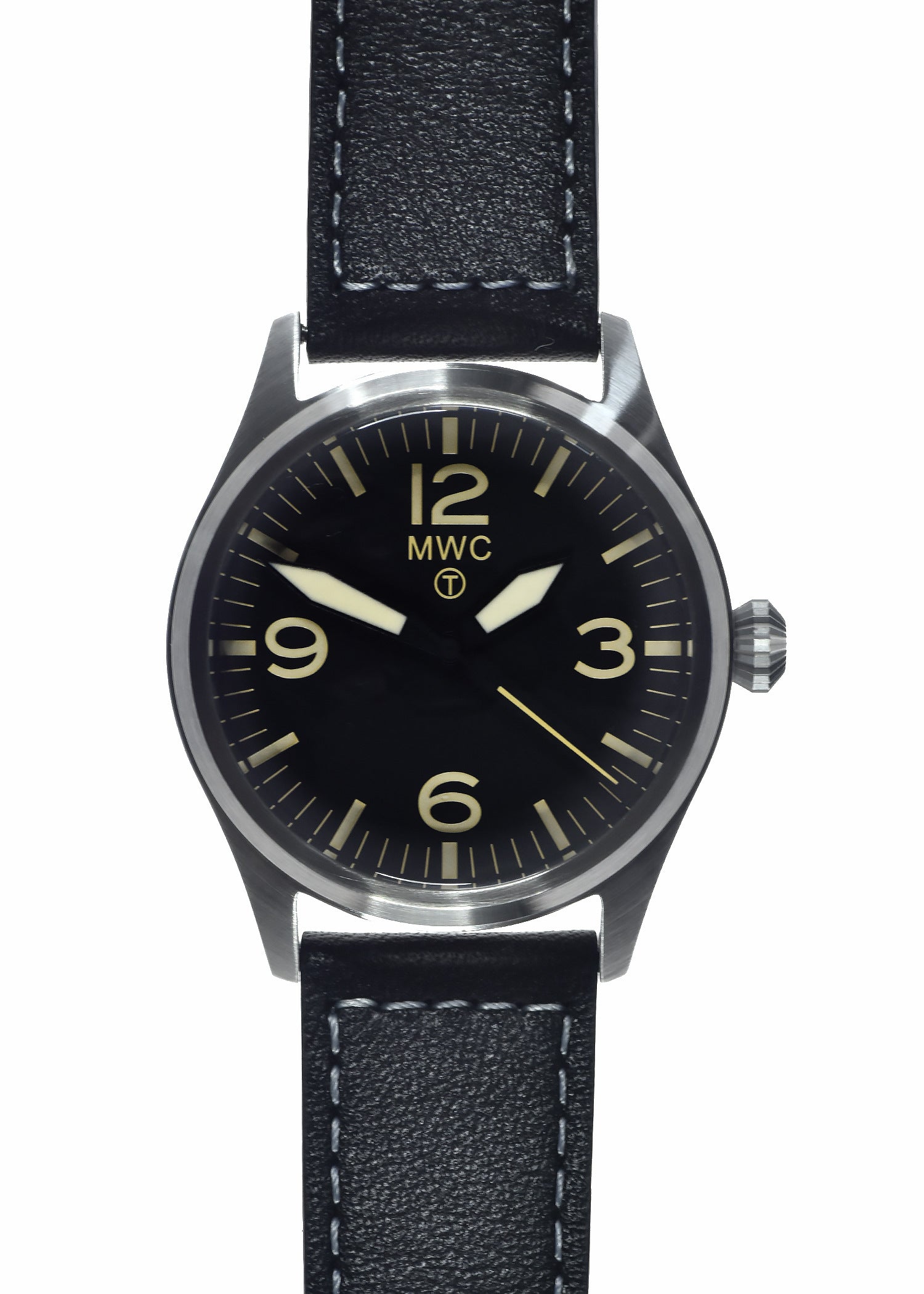 This MWC classic aviator model is 100m water resistant with a solid stainless steel case and screw-down crown and case back. The classic design and retro style crown combined with the low maintenance and highly accurate hybrid movement make this a unique and very desirable timepiece.