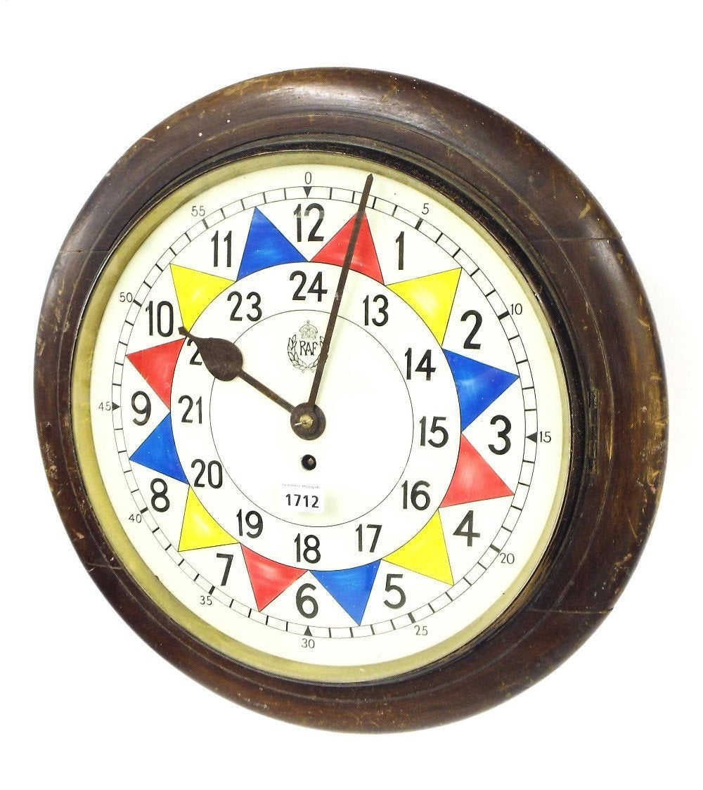 Over the years, several variants of the sector clock emerged, differing slightly in face details, but all shared the distinctive red, blue, and yellow triangle segments. Originals came in mechanical or electric versions—ours includes a sweep second hand, just like the wartime electric models.