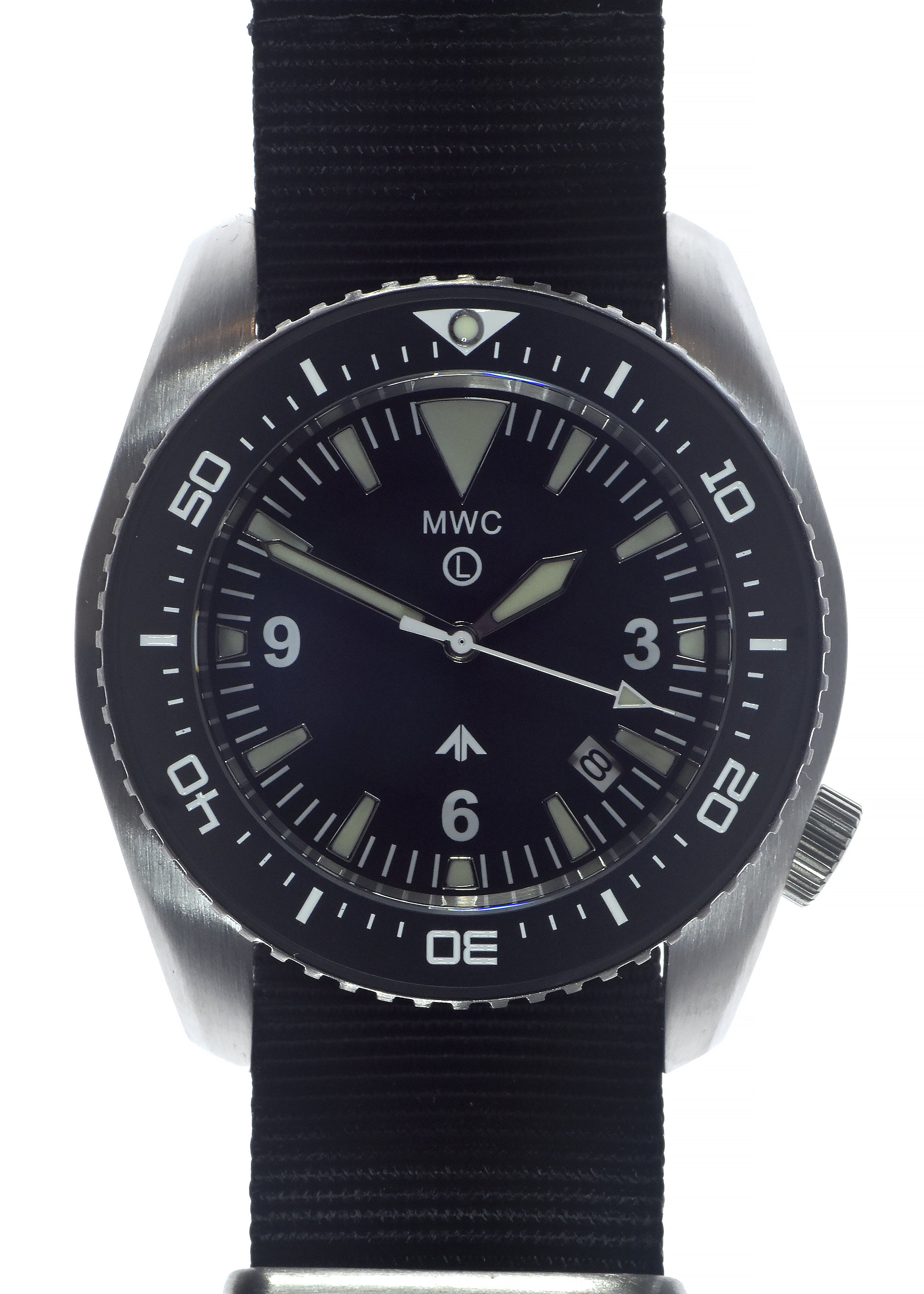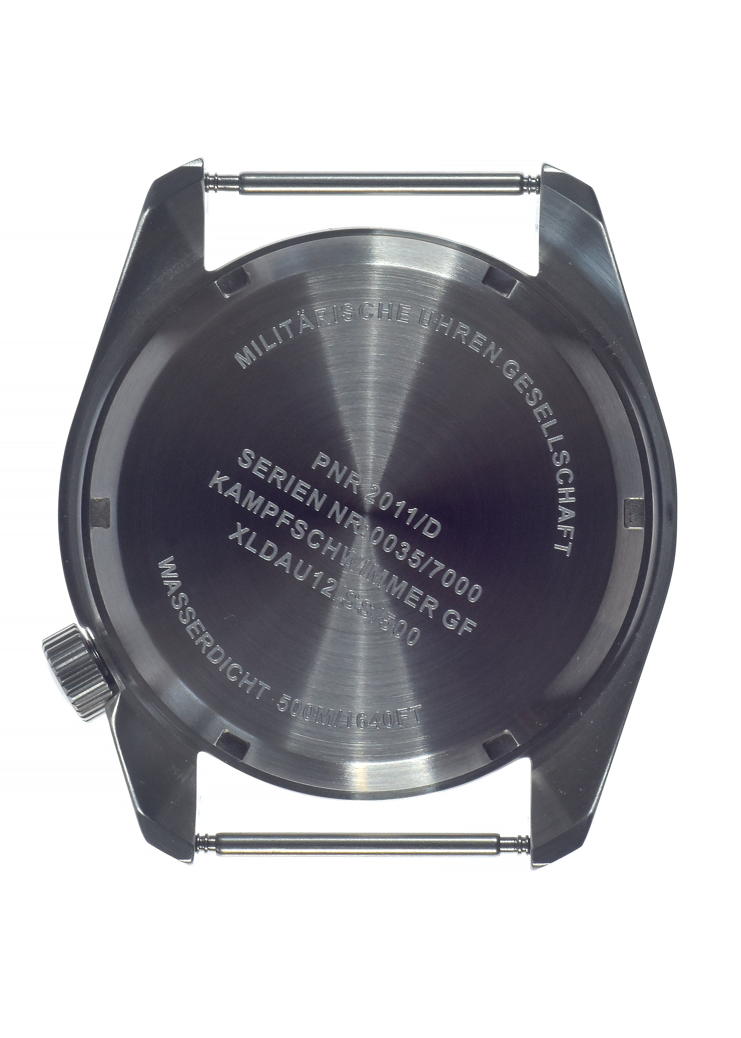 The MWC Kampfschwimmer (Military Diver) 500 m water-resistant models with helium escape valve are one of MWC's latest heavy-duty range of divers watches and have a significantly more robust case than most other military dive watches, they also have additional crown protection, in addition, this model also has the advantage of an impact-resistant sapphire crystal and a scratch-resistant ceramic bezel.