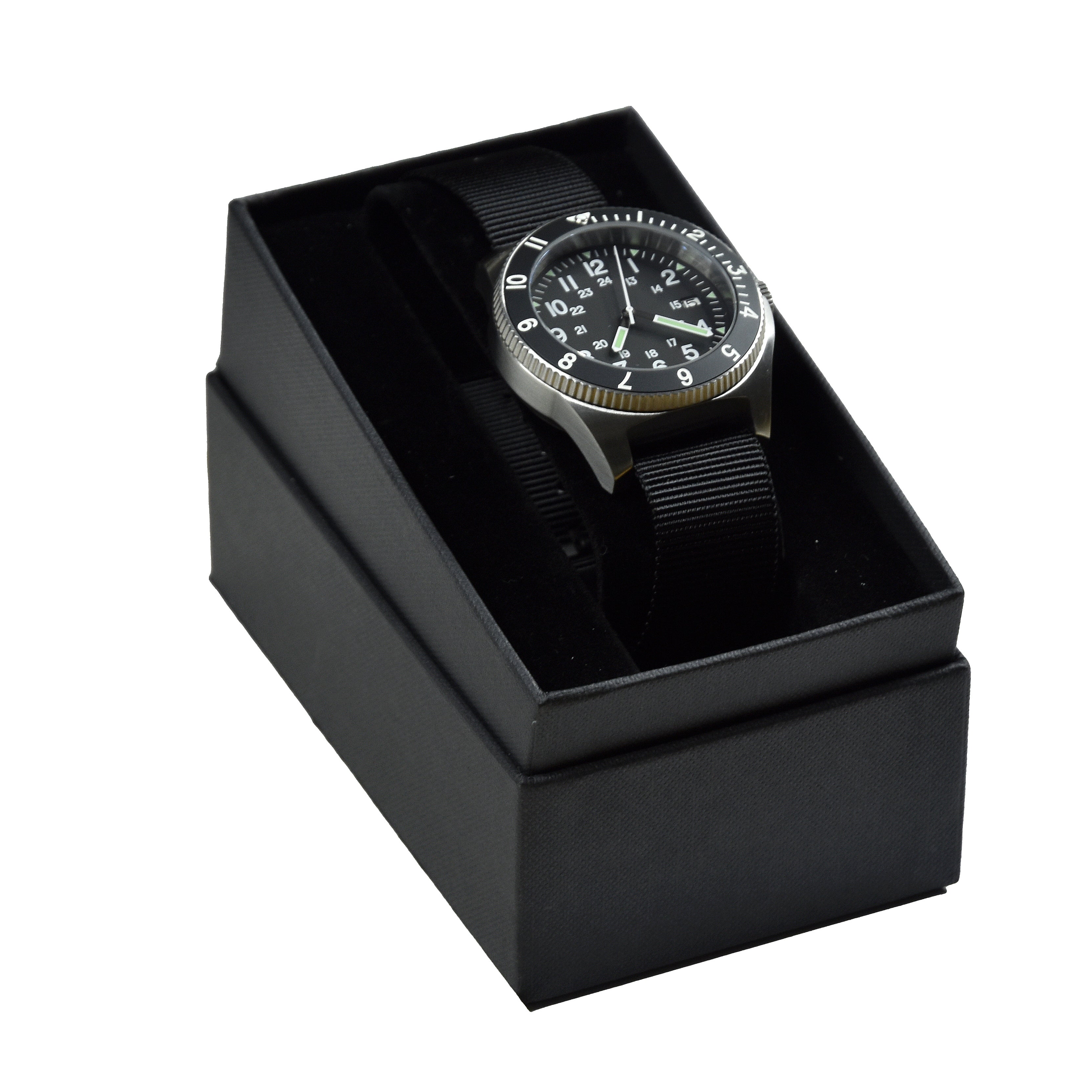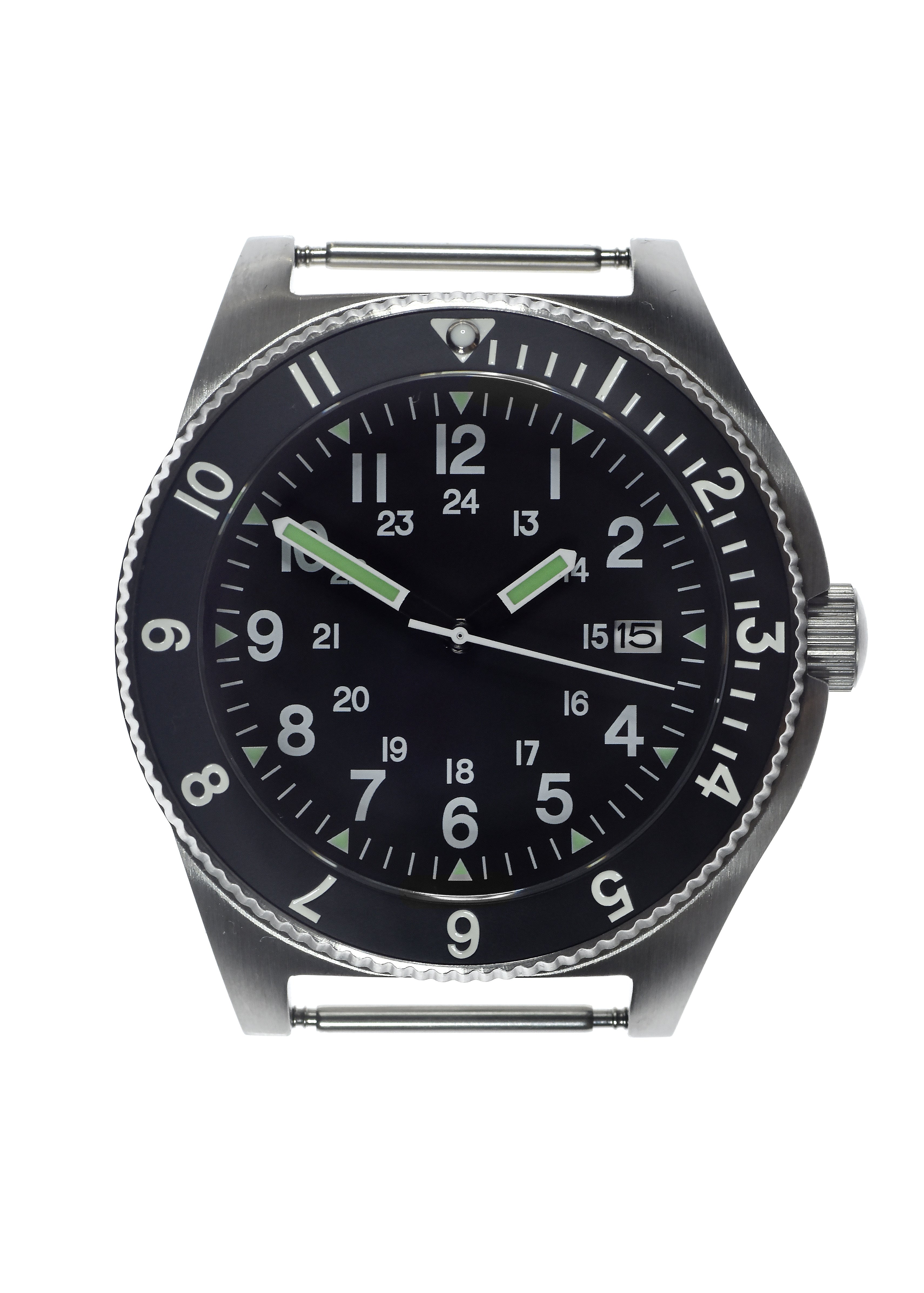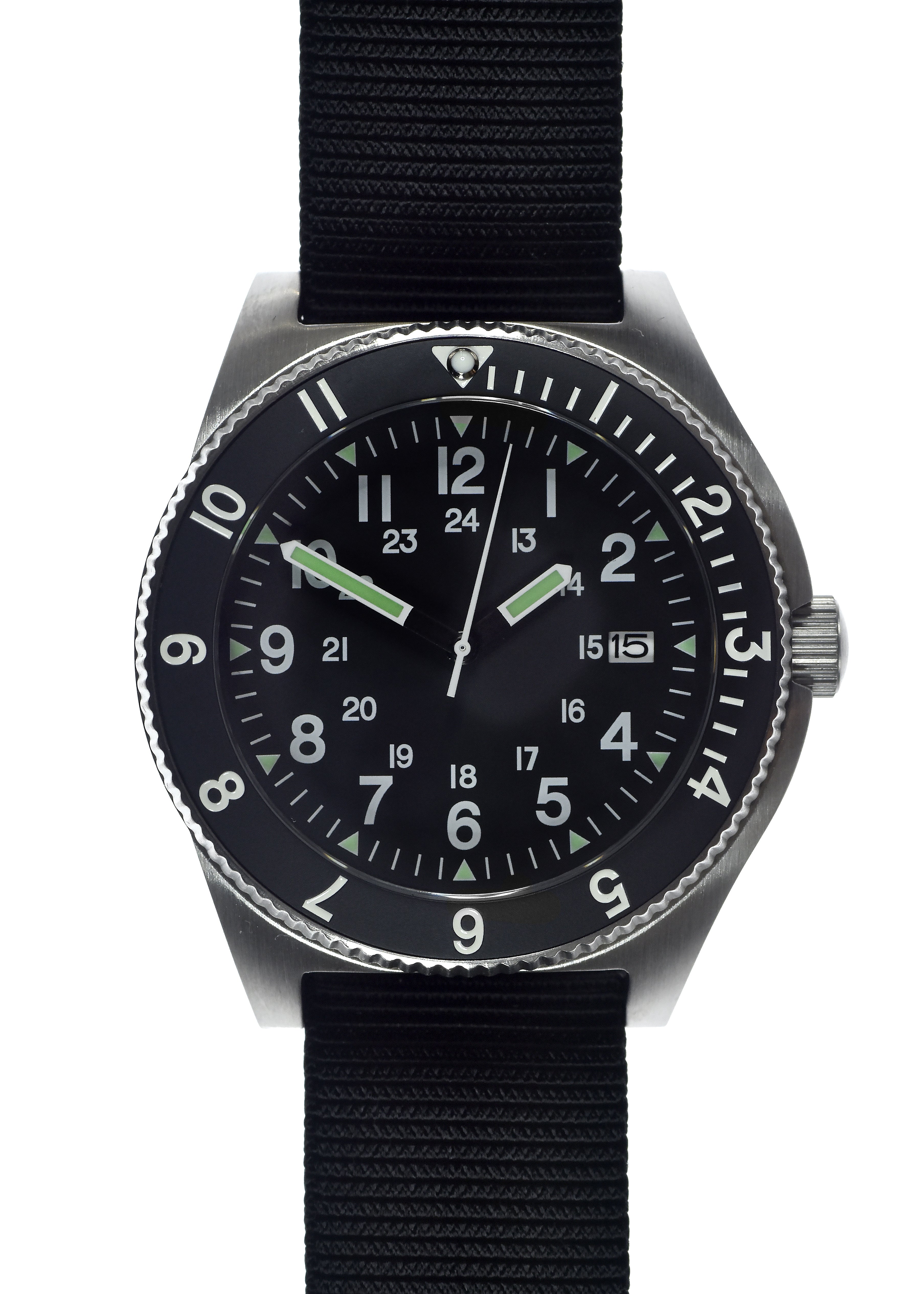 These robust 300m water-resistant watches were specifically designed for marine, surface and airborne navigation applications, manufactured to U.S MIL-PRF-46374G specification. The watches all have a 12hr bezel, which offers a very simple and straightforward method to track a second time-zone. The bezel has high visibility numerals and the dial is also very clear and easy to read even under adverse light conditions. The watch uses Luminova which is a non-radioactive paint which stores light and releases it progressively during the night.