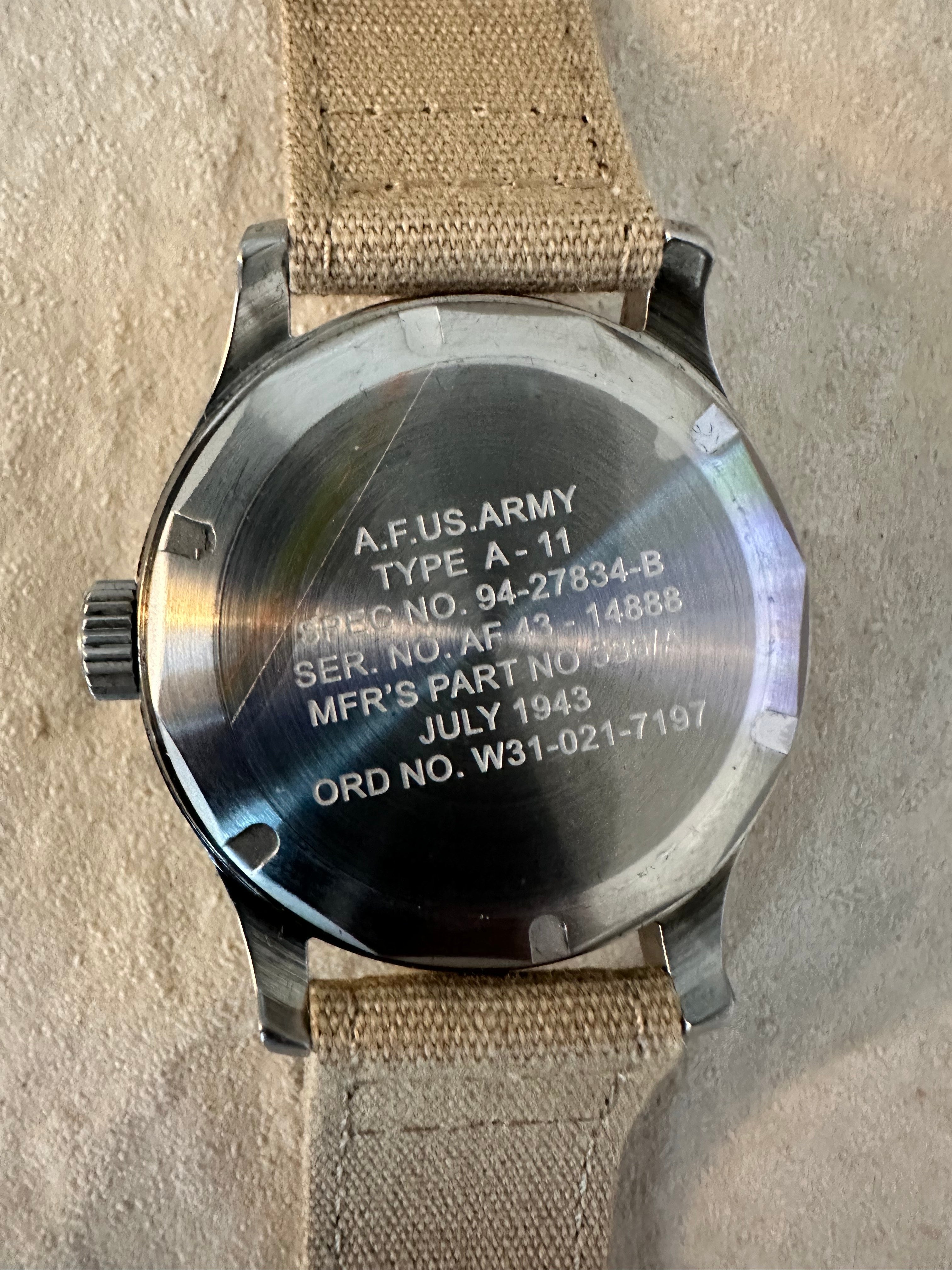 This recreation is based closely on the original World War Two design from 1943 but has the advantage that it is now equipped with a high performance self-winding 24 jewel mechanical movement, screw caseback and 100 m water resistance. The watches back in WW2 were made in a variety of slightly different styles by Elgin, Bulova and Waltham but were all based on an original US government specification laid down at the time. This watch is closest to the Elgin 539 which used a 15 or 16 jewel movement and were made for the USAAF between 1940 and 1945. The original watch was made from plated base metal (to save steel) but this modern recreation is solid stainless steel so it should stand the test of time better than the originals.