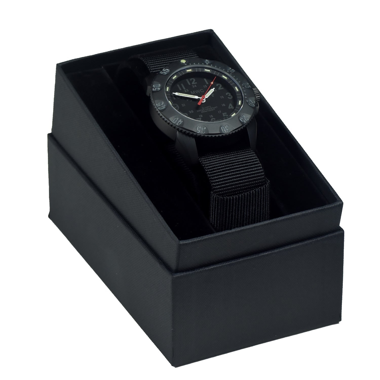 This robust 300m water-resistant MWC Tactical Series watch in a titanium case is specifically designed for law enforcement, marine, surface, and airborne applications. It surpasses U.S. W-46374F Type 6 specifications and is regularly ordered in bulk by clients for various applications. The design, based on mid-1990s models, features multiple upgrades. Notably, the solid titanium case and bezel replace the original polyamide material. The watch also includes a shatter-resistant sapphire crystal, water resistance increased from 30m to 300m (99ft to 1000ft), and a screw-down locking crown and caseback. The bezel has high visibility numerals, and the subdued dial is easy to read even under adverse light conditions. The watch uses Swiss Tritium GTLS (Gaseous Tritium Light Sources), which are significantly brighter than any conventional luminous watch.