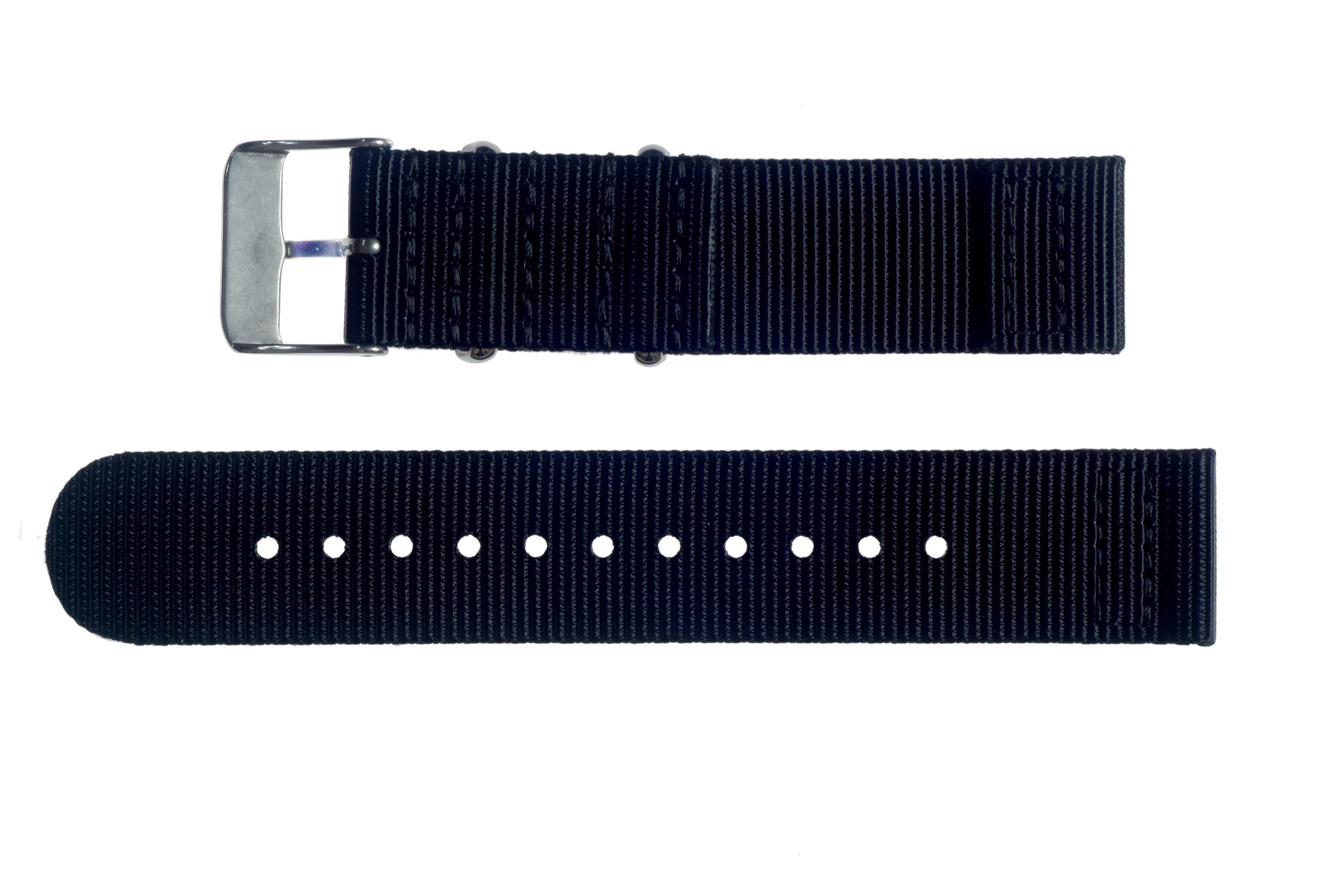 Classic 2 piece variant of the standard NATO Watchband made from fast drying ballistic nylon webbing with stainless steel fasteners. This high tech material is ideally suited for use in military watch straps because it is robust, comfortable and long lasting. The two piece NATO strap is a great alternative to the one-piece variant and potentially works better on some models.