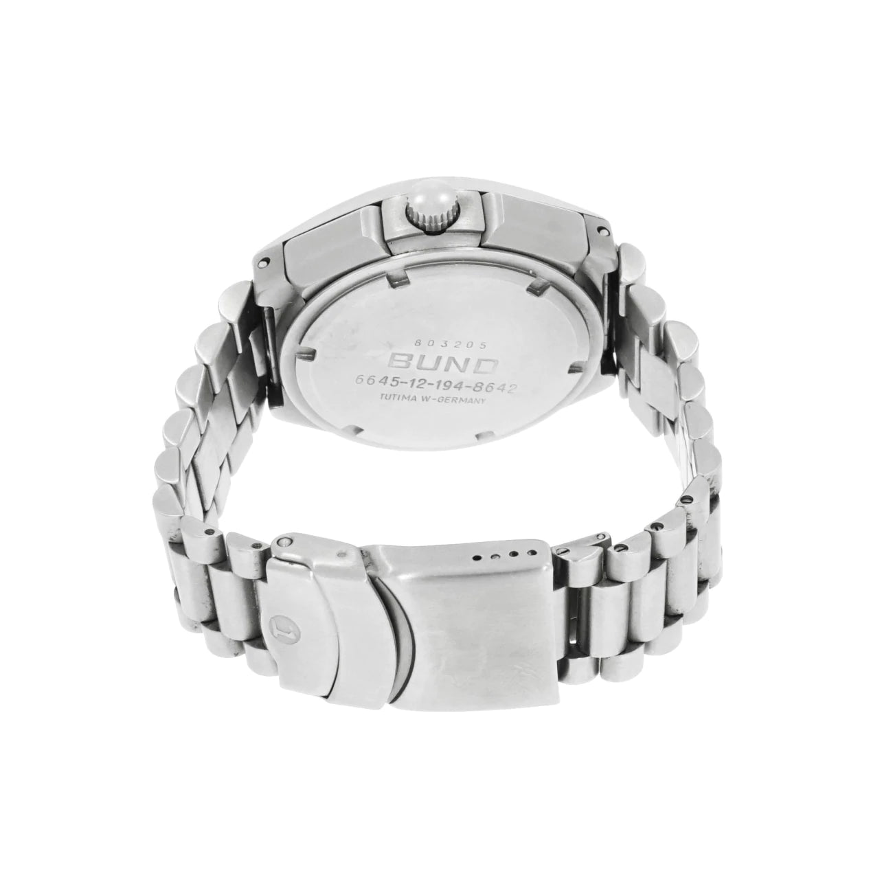 Tutima Military Chronograph NATO Reference 6645-12-194-8642 current German Luftwaffe issue as new condition, self-winding, stainless steel case, screwed-down case back & winding crown, stainless bracelet, black dial with day, date, 24-hour-display, 60-minutes- & 12- hour-counter, second-stop at hand-setting, caliber Lemania 5100, 17 jewels.