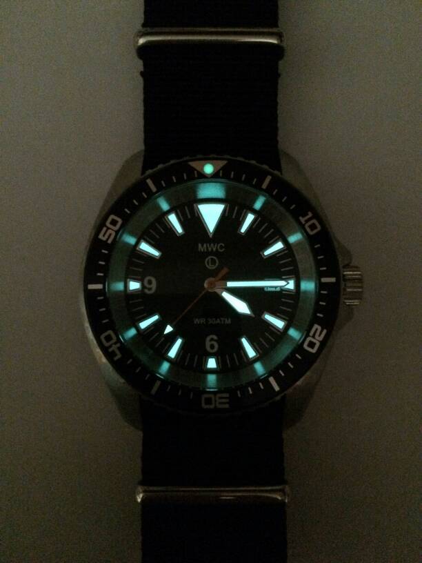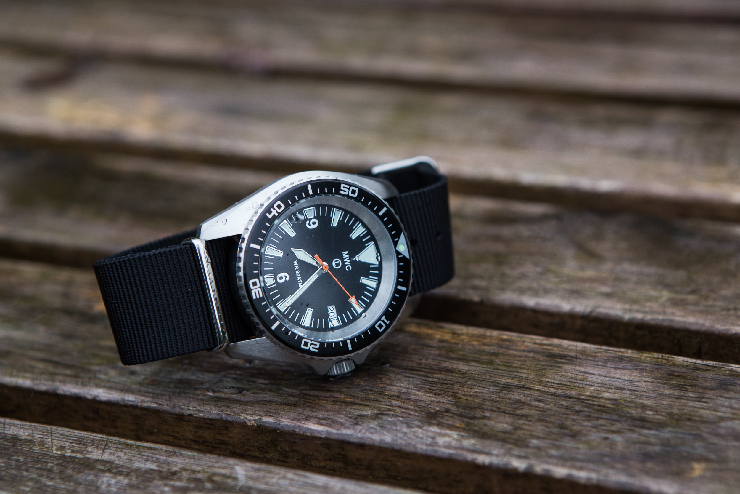 The thicker bezel makes the watch easier to grip, a feature specified in a procurement contract as these watches were designed for use by police and military divers, as well as operators in inflatables working in cold and extreme environments. This particular model has a standard European NATO format dial.