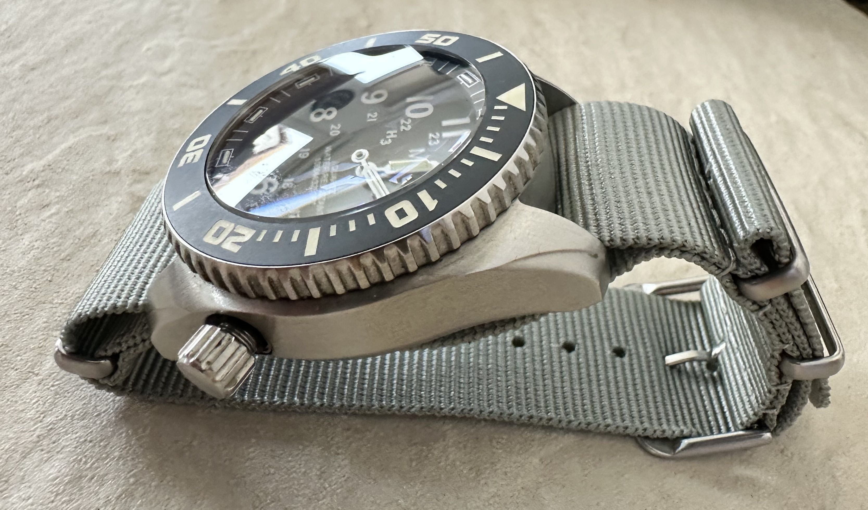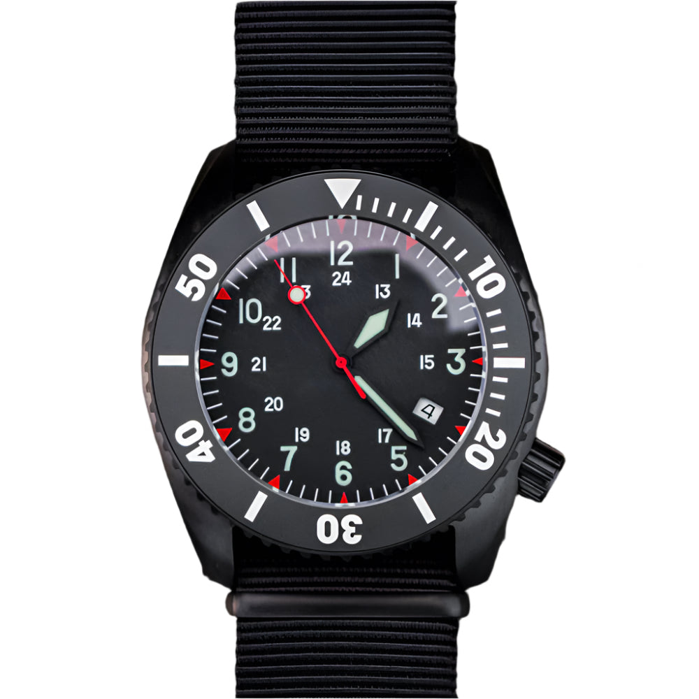 The MWC "Depthmaster" range of Military Divers models are MWC's latest heavy-duty range and are both extremely robust with a sapphire crystal and suitable for diving with mixed gases at extreme depths due to the 100atm water resistance rating, they also have a wider strap at 24 mm (most military divers watches use a 20mm strap) and a non-scratch ceramic bezel which is easier to grip in very cold and icy conditions. This model also has tritium GTLS tubes for maximum nighttime and low light performance. The Depthmaster range is specifically designed for use by professional divers under challenging conditions.