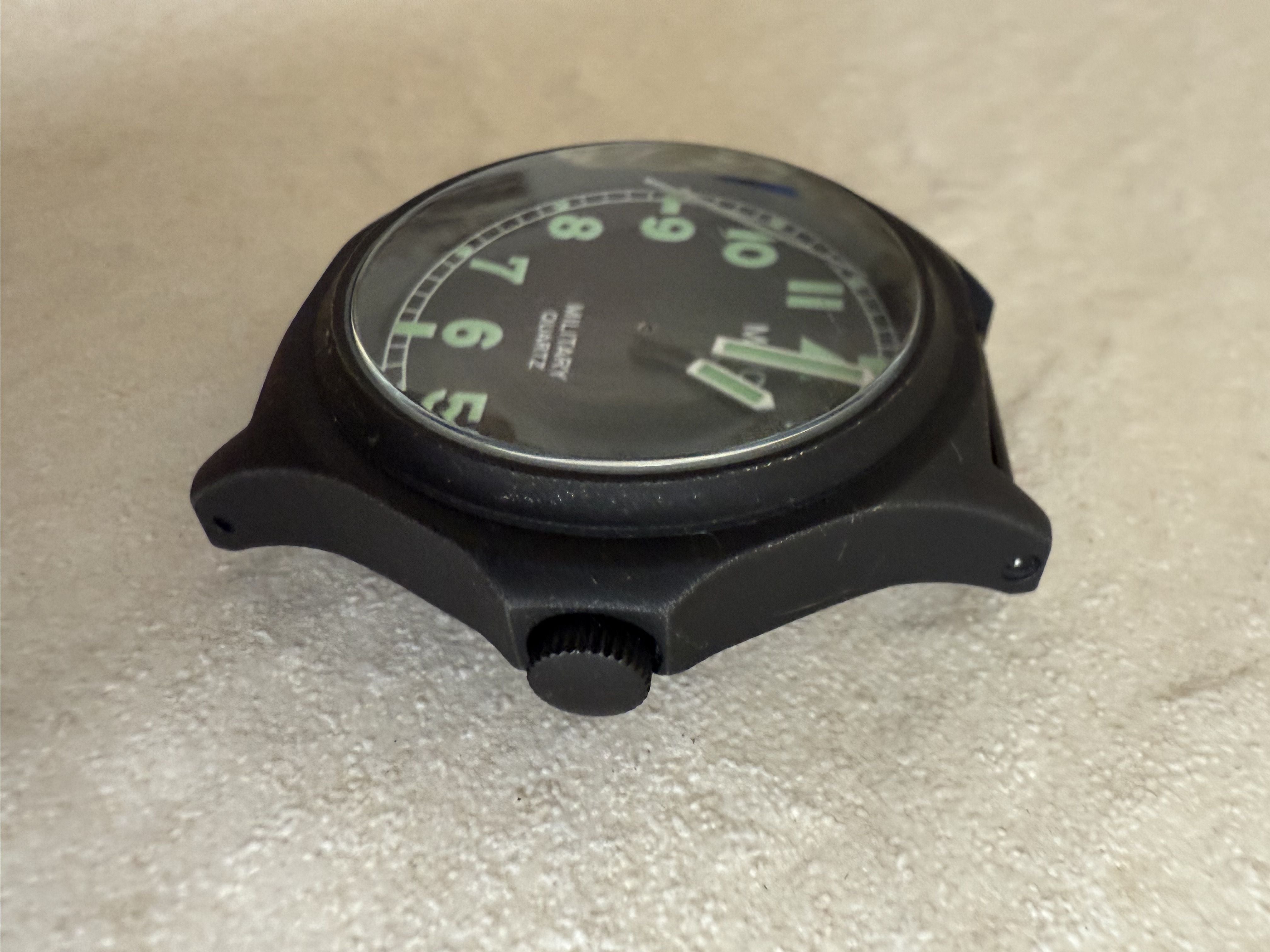 Our PVD plated G10 Stealth model boasts a unique design, combining historical elements with modern enhancements. MWC was the first contractor to produce standard European Infantry specification watches with a non-reflective PVD plated black finish, a feature highly demanded by special forces units. Unlike painted finishes that can fade or rub off, the black finish on this watch is achieved through a chemical PVD plating process that alters the steel's color at a molecular level, ensuring durability even under heavy usage. However, it can be damaged if severely gouged or abraded.