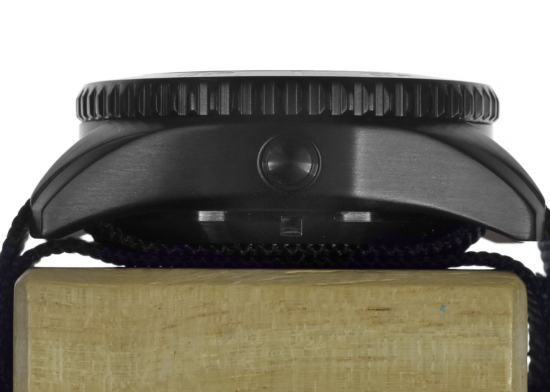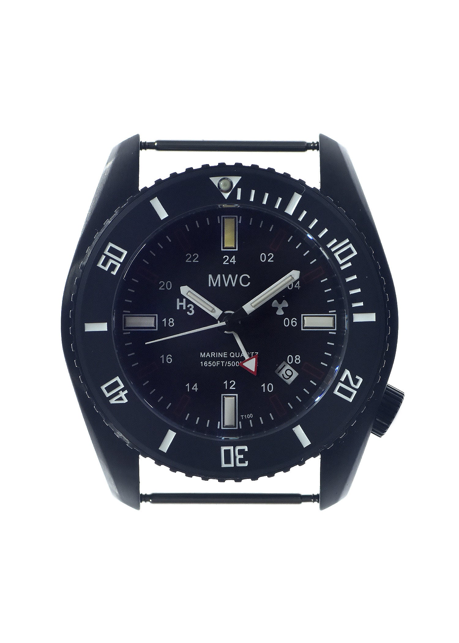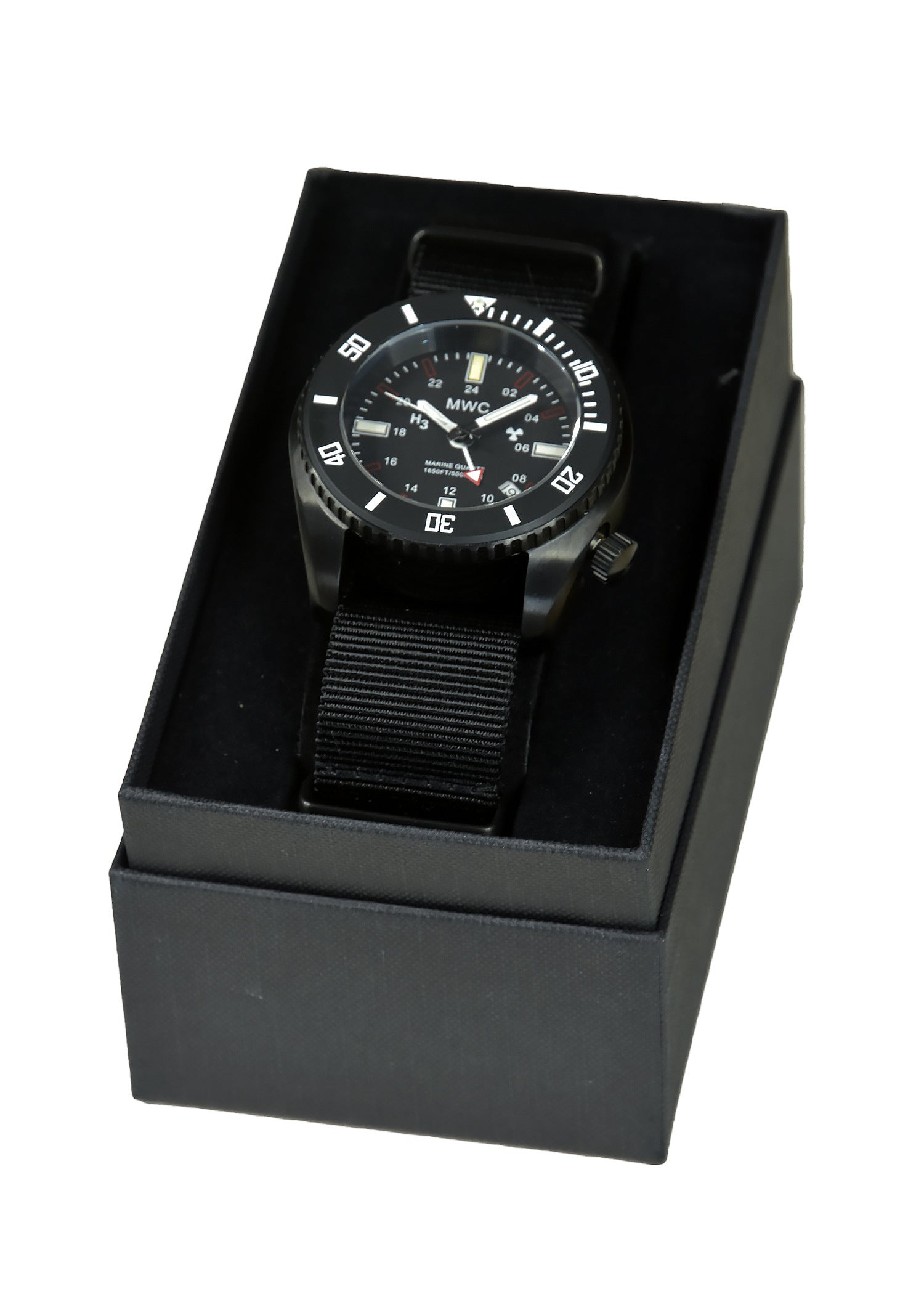 This particular variant features a 24-hour military format dial and is finished in black PVD stainless steel. The special covert matte black non-reflective PVD finish used for this watch is often specified in military contracts for special forces units, anti-terrorist units, and various covert operations. The PVD process alters the color of the steel at a molecular level, making it vastly superior to the painted finishes used on lower-quality watches, which can easily fade or rub off. This ensures that the watch's finish remains intact even during heavy usage, although it can be damaged if the case is severely gouged or worn down by continuous heavy abrasion against rocks or other hard surfaces.