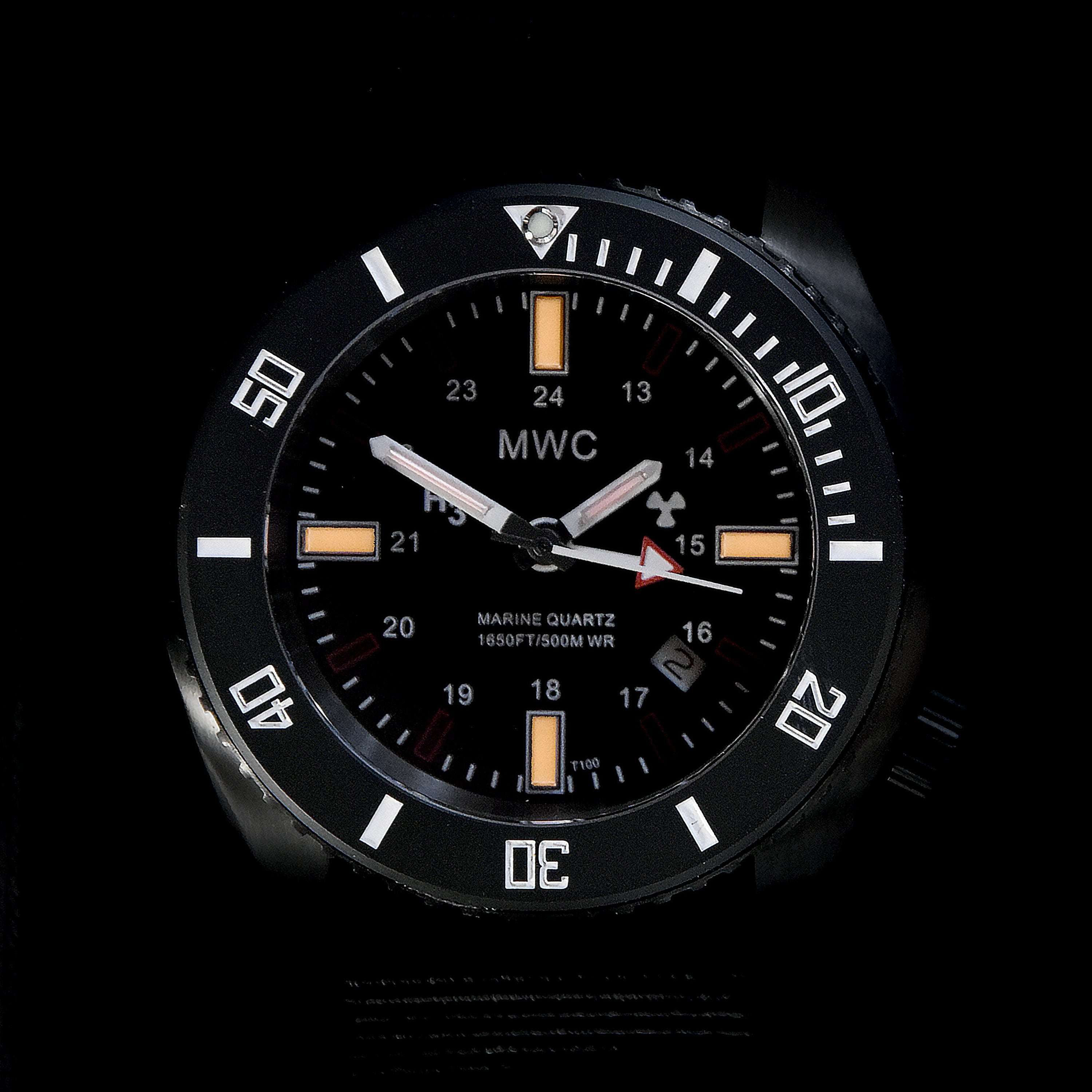 These watches were originally commissioned by submarine crews who needed timepieces suitable for "rigged for red" lighting conditions—red illumination used to preserve night vision when surfacing or using a periscope at night, dawn, or dusk. The bright red T100 GTLS tritium tubes on this model provide exceptional low-light readability without disrupting ambient red lighting, giving operators a critical edge when timing really matters.