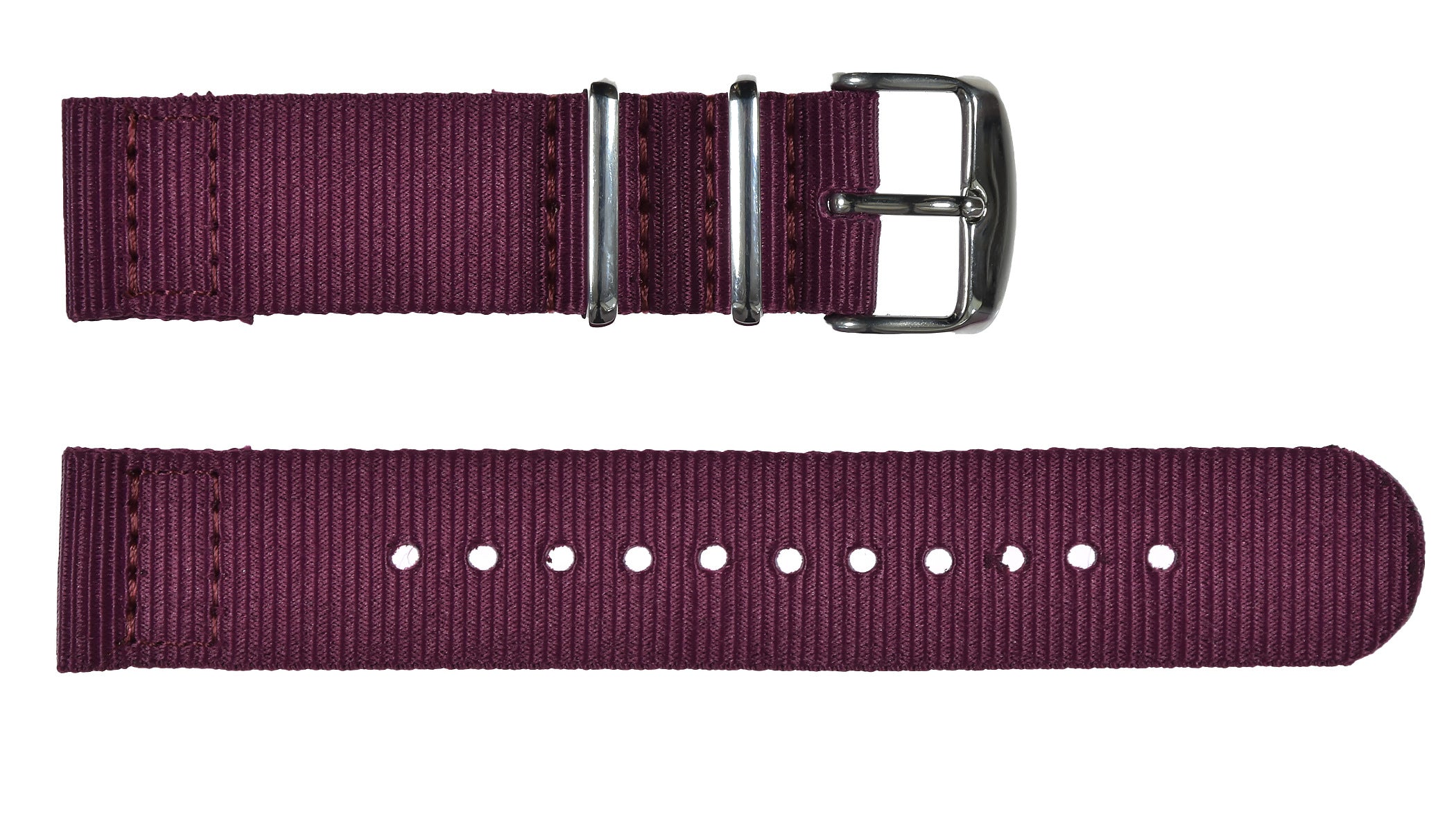 Classic 2 piece variant of the standard NATO Watchband made from fast drying ballistic nylon webbing with stainless steel fasteners. This high tech material is ideally suited for use in military watch straps because it is robust, comfortable and long-lasting. The two-piece NATO strap is a great alternative to the one-piece variant and potentially works better on some models.