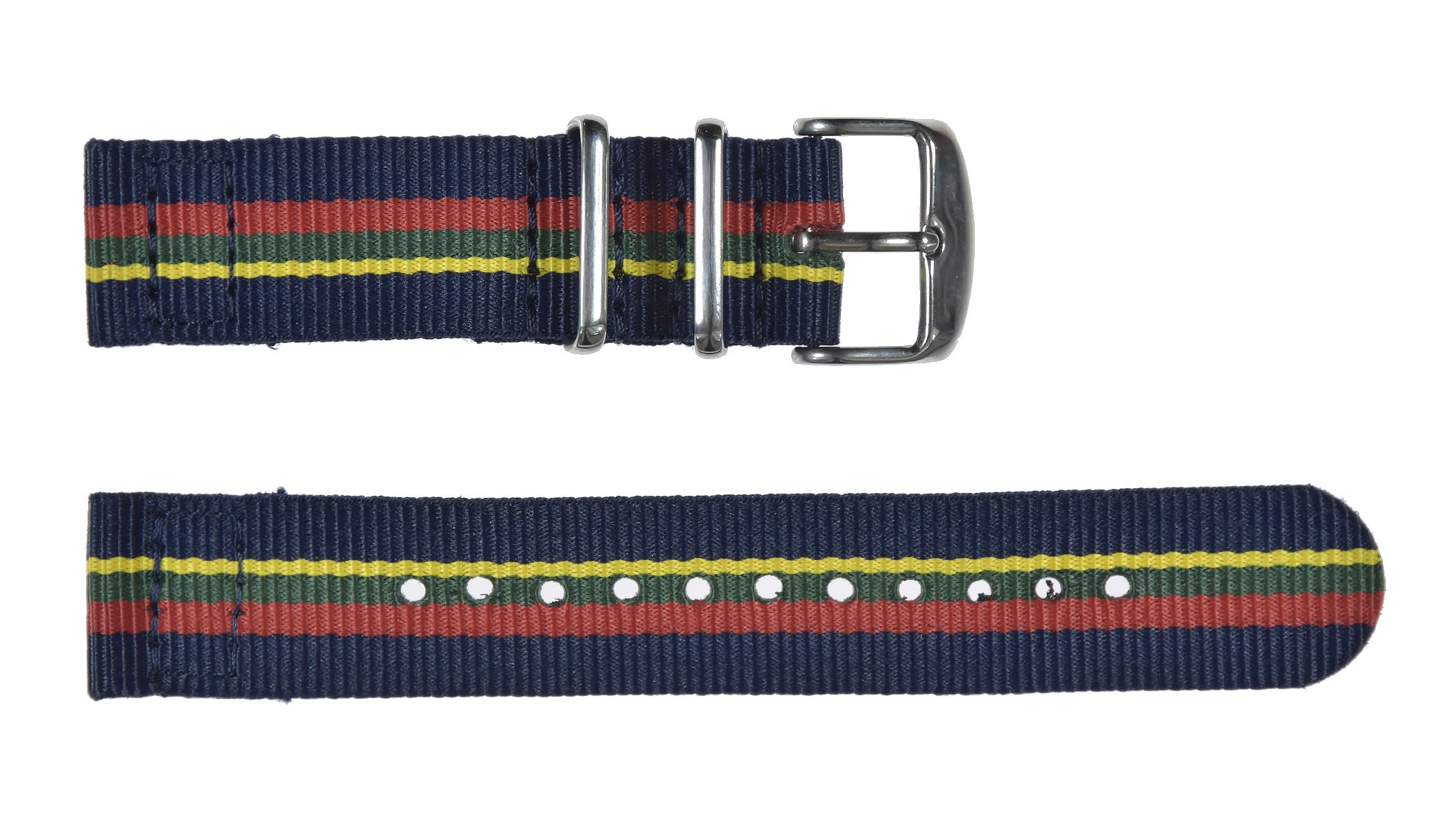 The history of the NATO strap is interesting and started out with the single grey 20mm band around 40 years ago and has expanded from there initially to RAF Blue, Black, and Navy Blue then to the James Bond pattern strap and Olive Green and from there we have made more and more variants in regimental colors, Search and Rescue SAR (which is an orange strap) and an unbelievable range of different designs in national colors, police unit colors and various camouflage options for specific situations. The straps are also frequently used by military units outside the UK and also purchased by serving military to use on a wide variety of military watches.