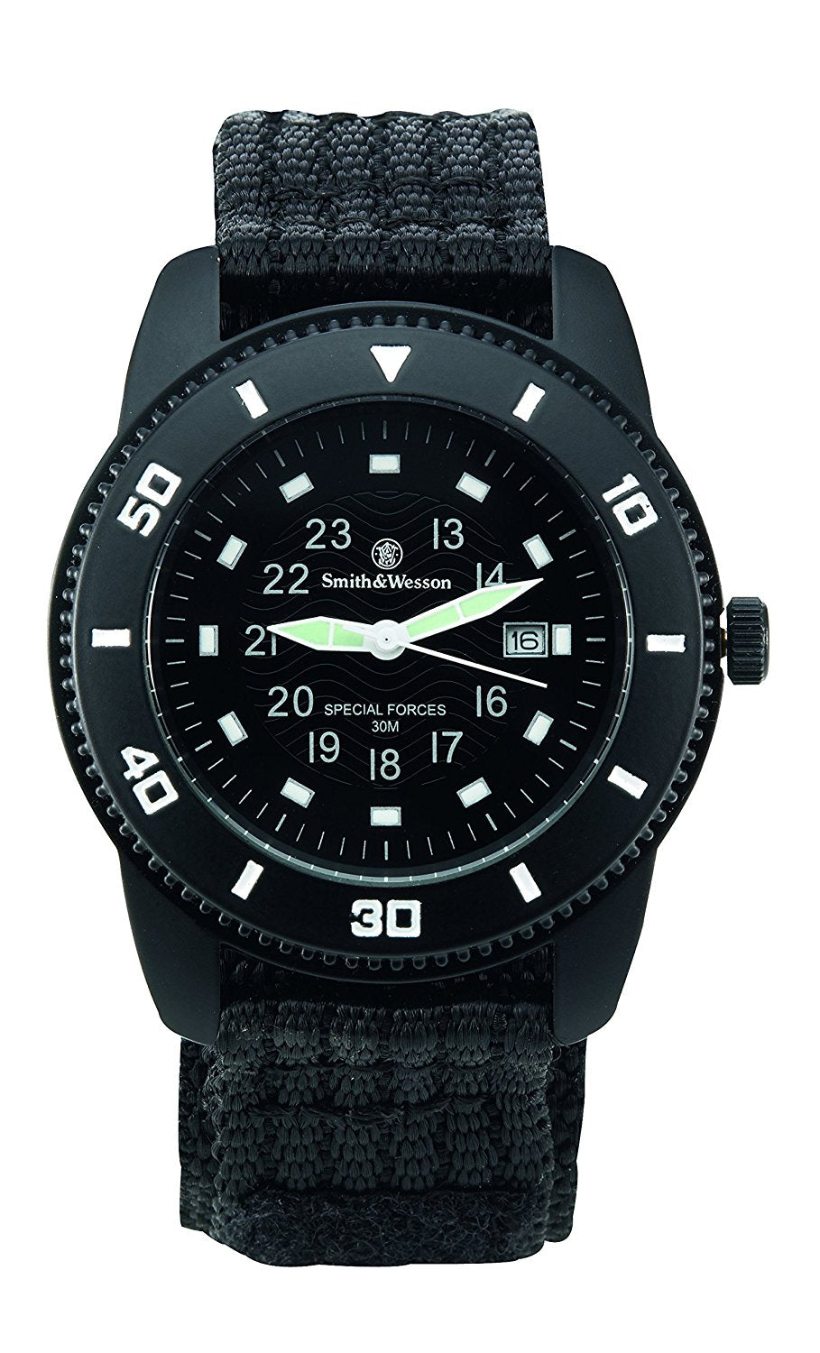 The Smith & Wesson SWW-5982 Commando Watch features a round black face with Smith & Wesson logo and nylon wristband. Crafted with all the precision and reliability that's made Smith & Wesson a staple in the law enforcement community. This watch features precision quartz movement and includes (3) hands to show the hours, minutes and seconds. Other features include glowing hands, date display and a scratch resistant hardened mineral glass crystal that protects the dial. The tough stainless steel case makes this watch shock resistant and the metal rotating bezel helps to track elapsed time. This timepiece is water resistant to 30-meters (99-feet) and ideal for anyone looking for adventure, sport or any daily rugged outdoor activity. The watch is 45mm wide and weighs only 102 gms (3.6-ounces).