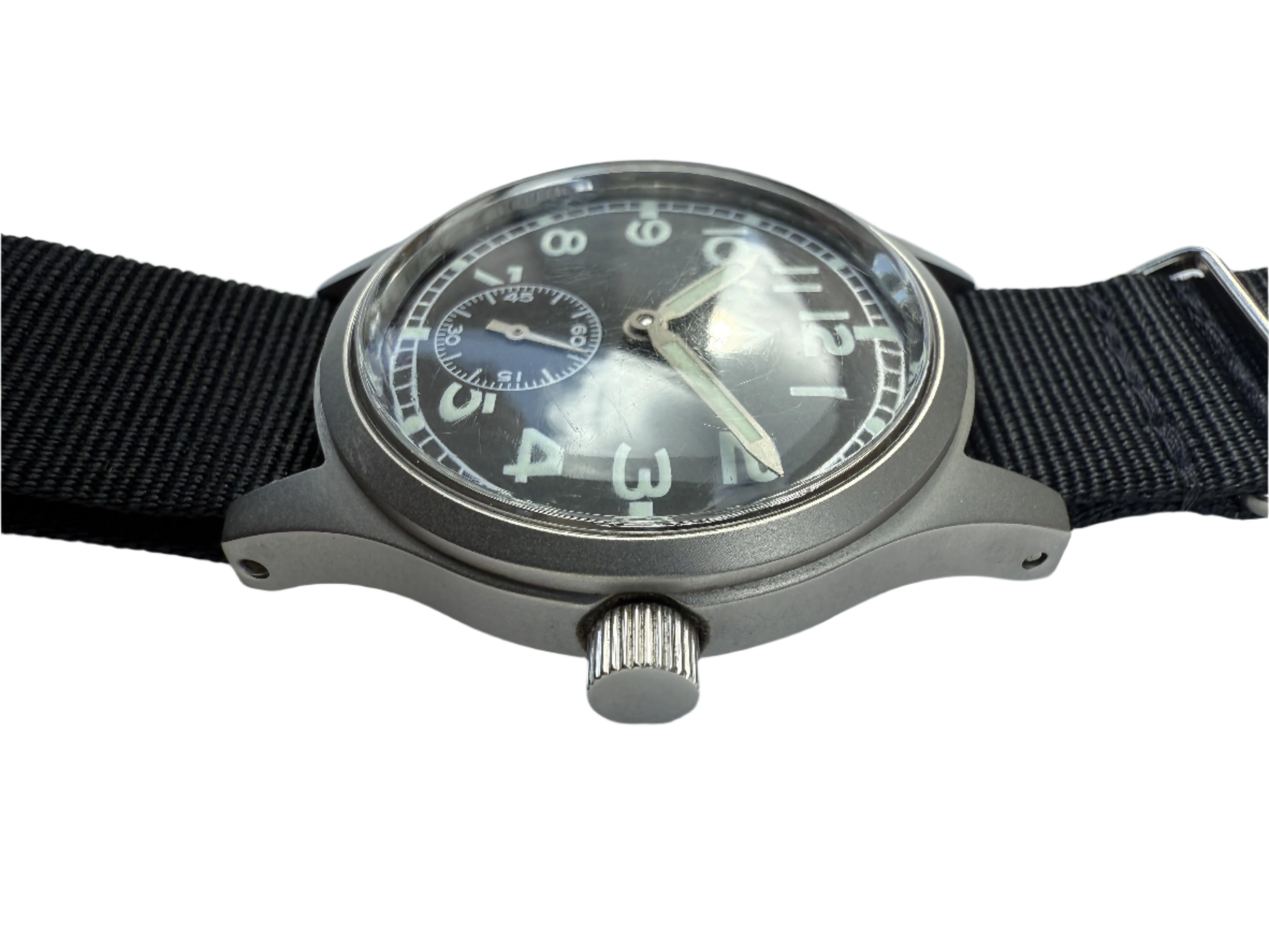 This model uses a self-winding automatic movement (which can also be manually wound) in place of the original hand-wound type but retains all key visual features – including an acrylic crystal and black dial with luminous indices. The case is crafted from military-grade 316L stainless steel and fitted with a canvas strap true to the era.
