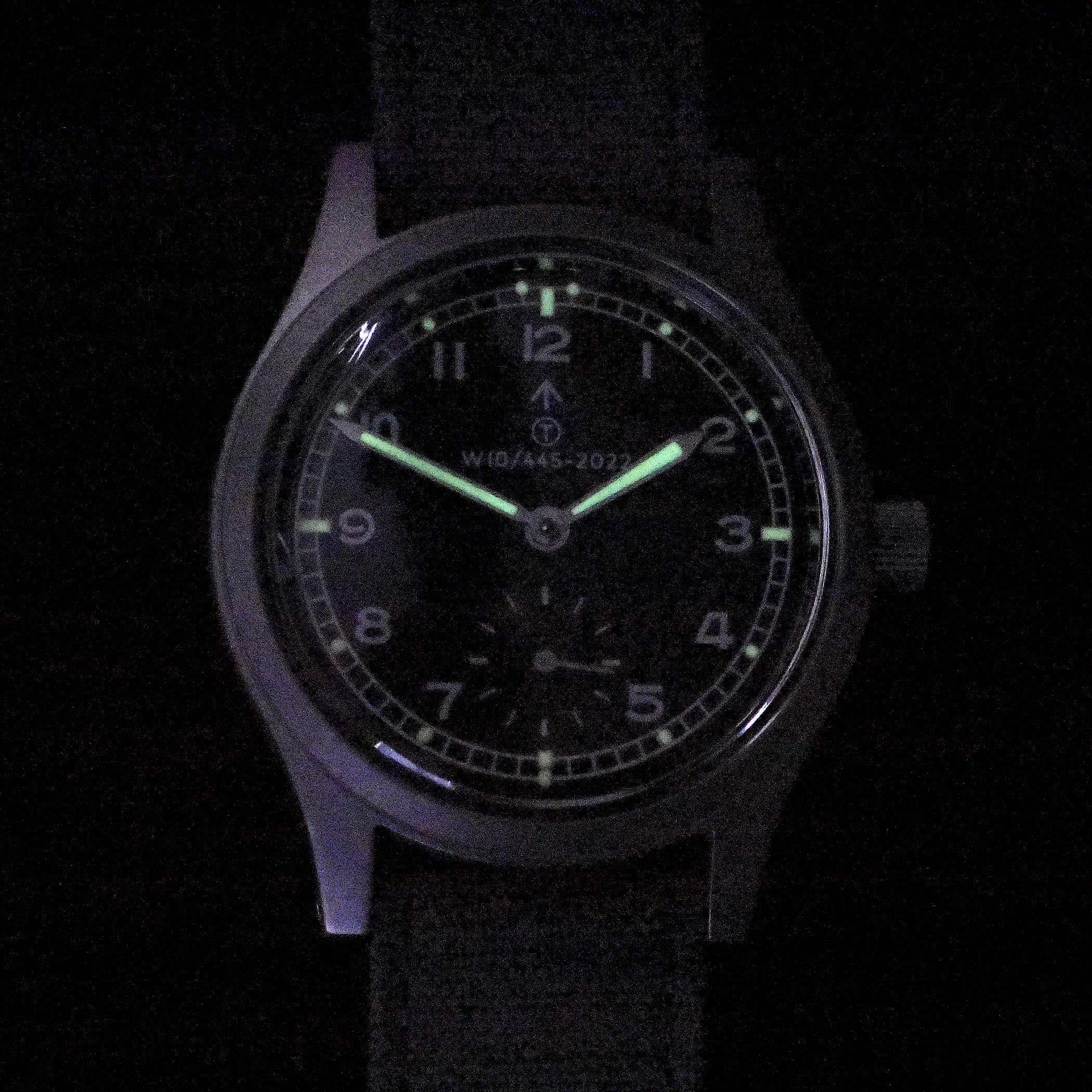This classic hand-wound MWC W10/445-23CH military watch is a modern recreation of the iconic British military timepieces used from the 1940s to 1950s. Powered by a Swiss Sellita SW216 24-jewel mechanical movement, it features a small subsidiary seconds dial and faithfully retains the look and feel of the original issue watches — but with several key upgrades for modern durability and reliability.