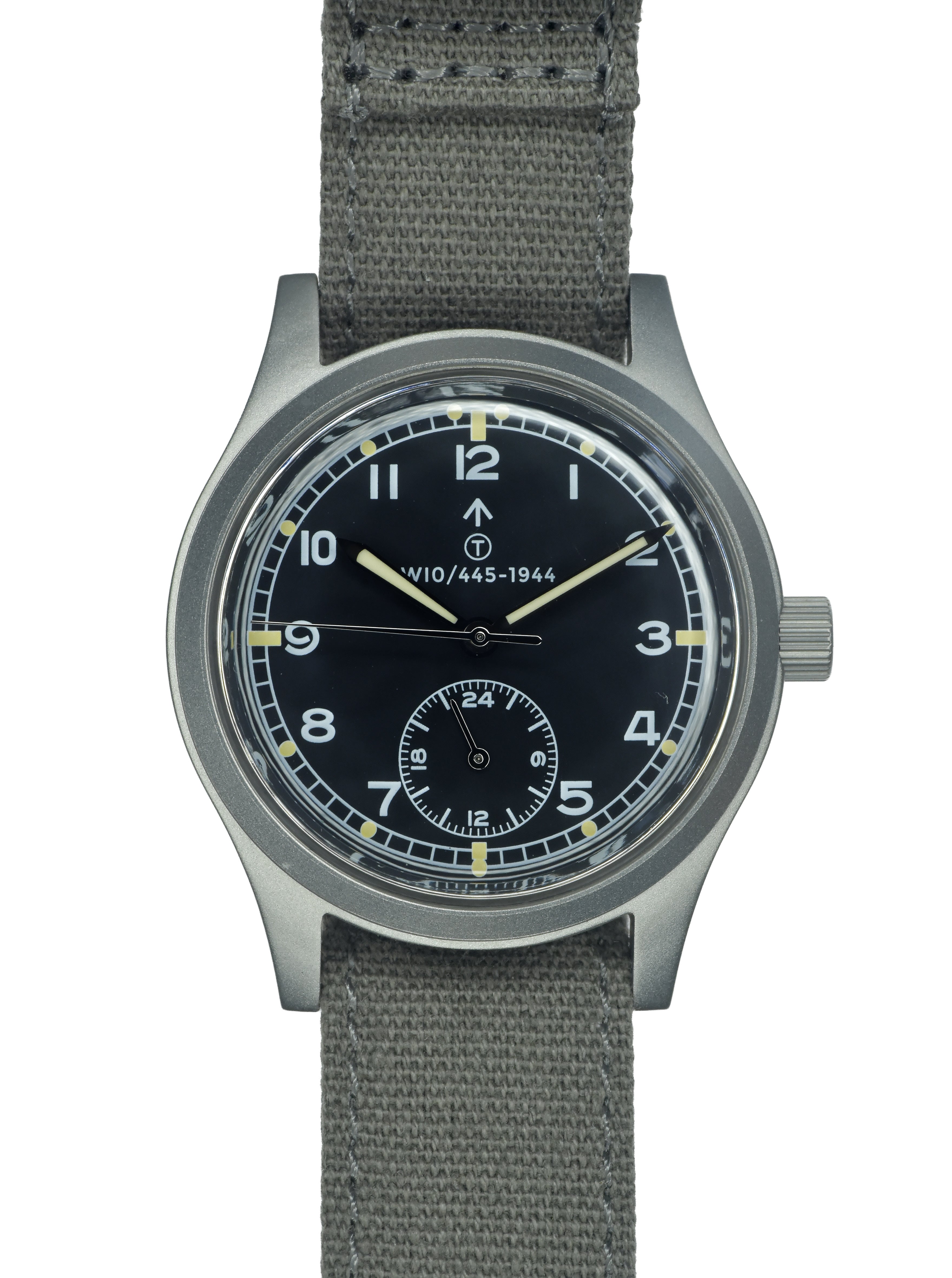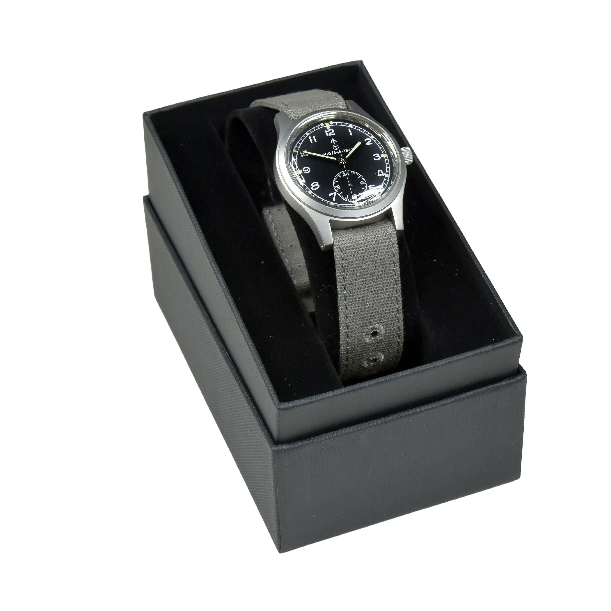 Equipped with an 18 mm canvas strap styled after those used by the British military during the 1940s and 1950s.