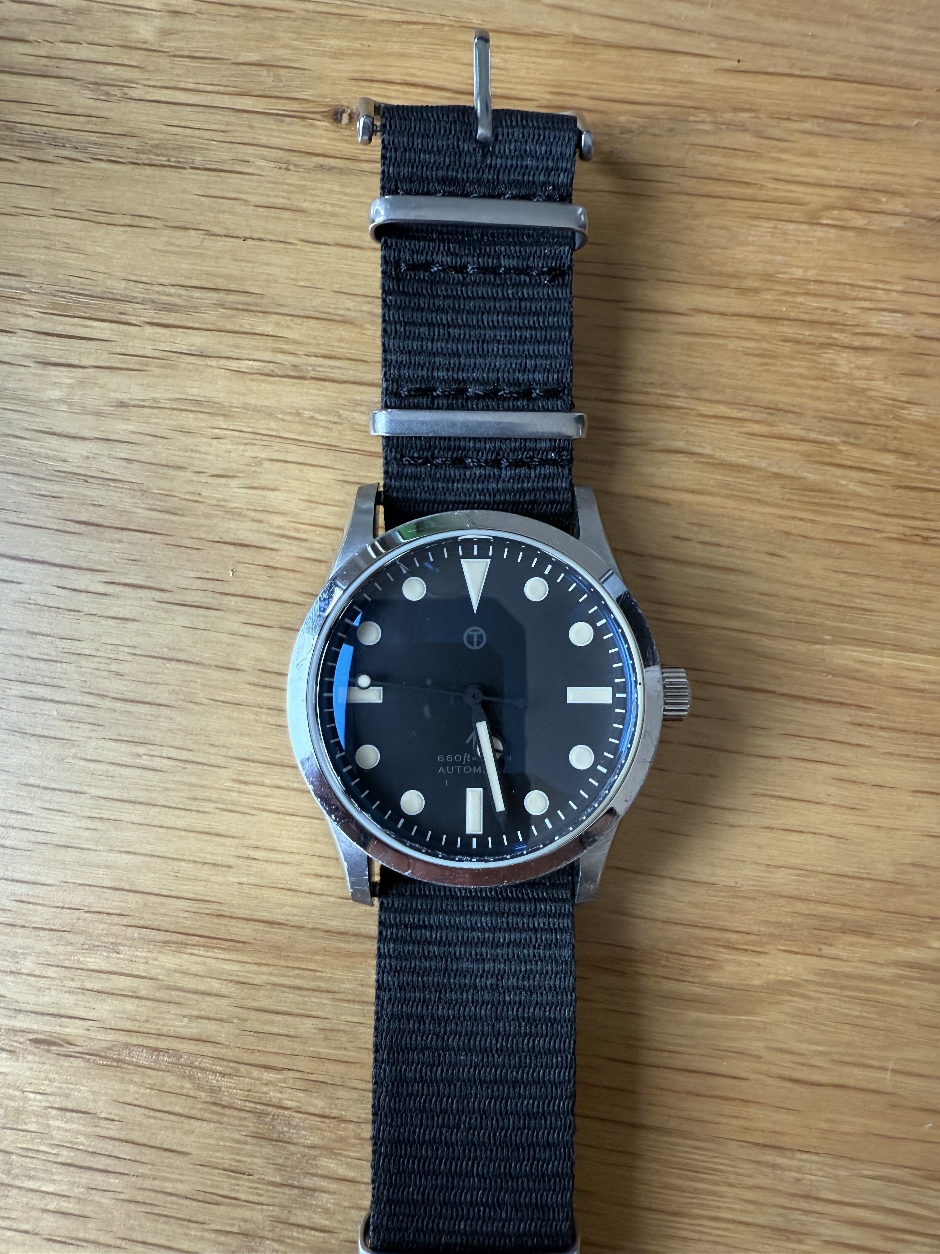 This watch is based on a 1950s/1960s military design. It features a box sapphire crystal that closely resembles the original plexiglass. The movement is a sophisticated Ronda R 150 or equivalent, boasting 25 jewels and a frequency of 28,800 vibrations per hour (4Hz). This high-precision mechanism offers a substantial 38-hour power reserve, ensuring reliable performance. Equipped with hacking and hand-winding capabilities, it exemplifies both efficiency and convenience.
