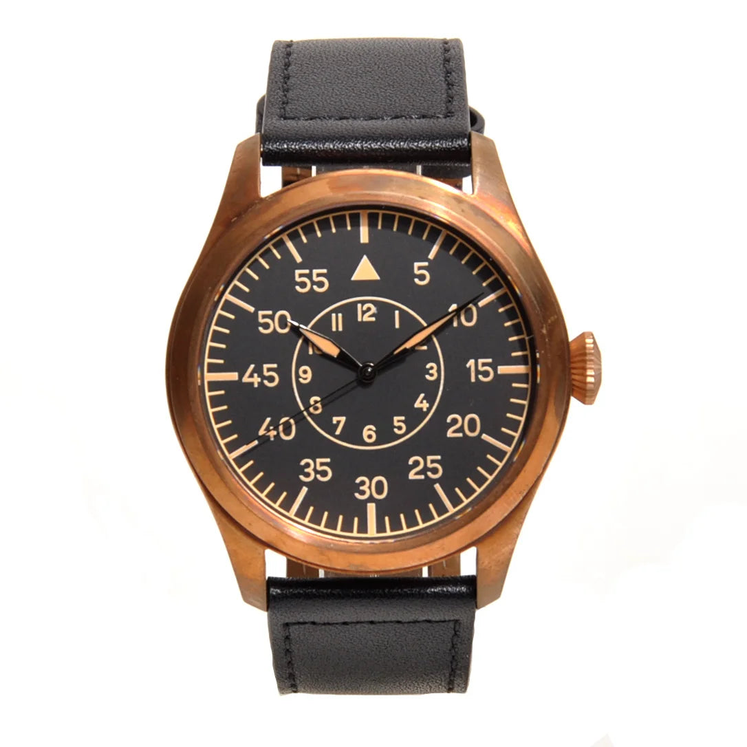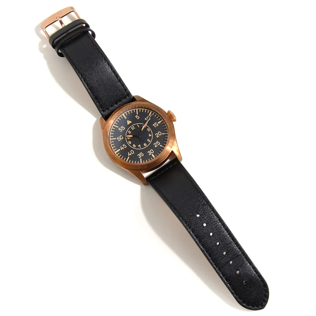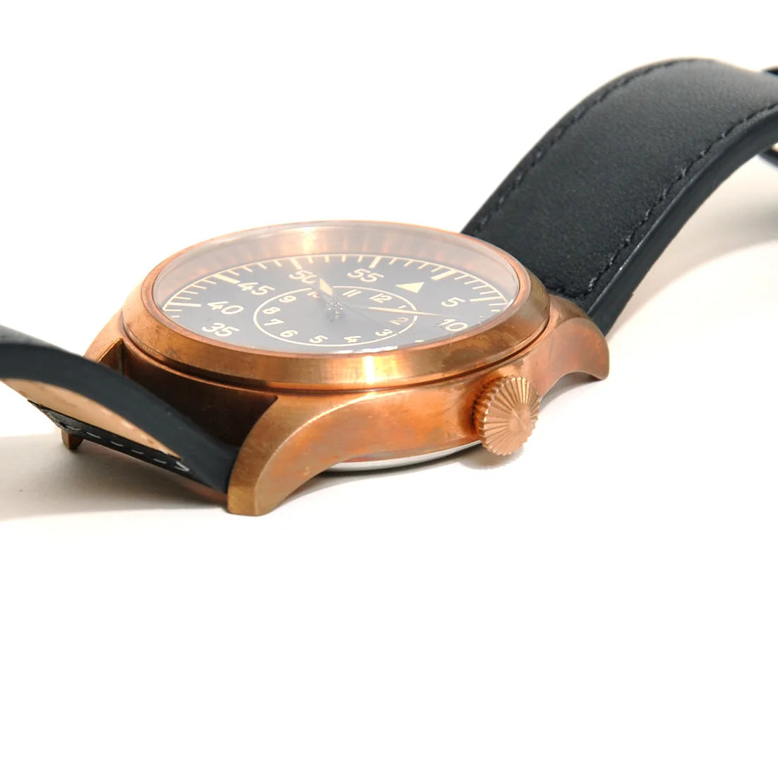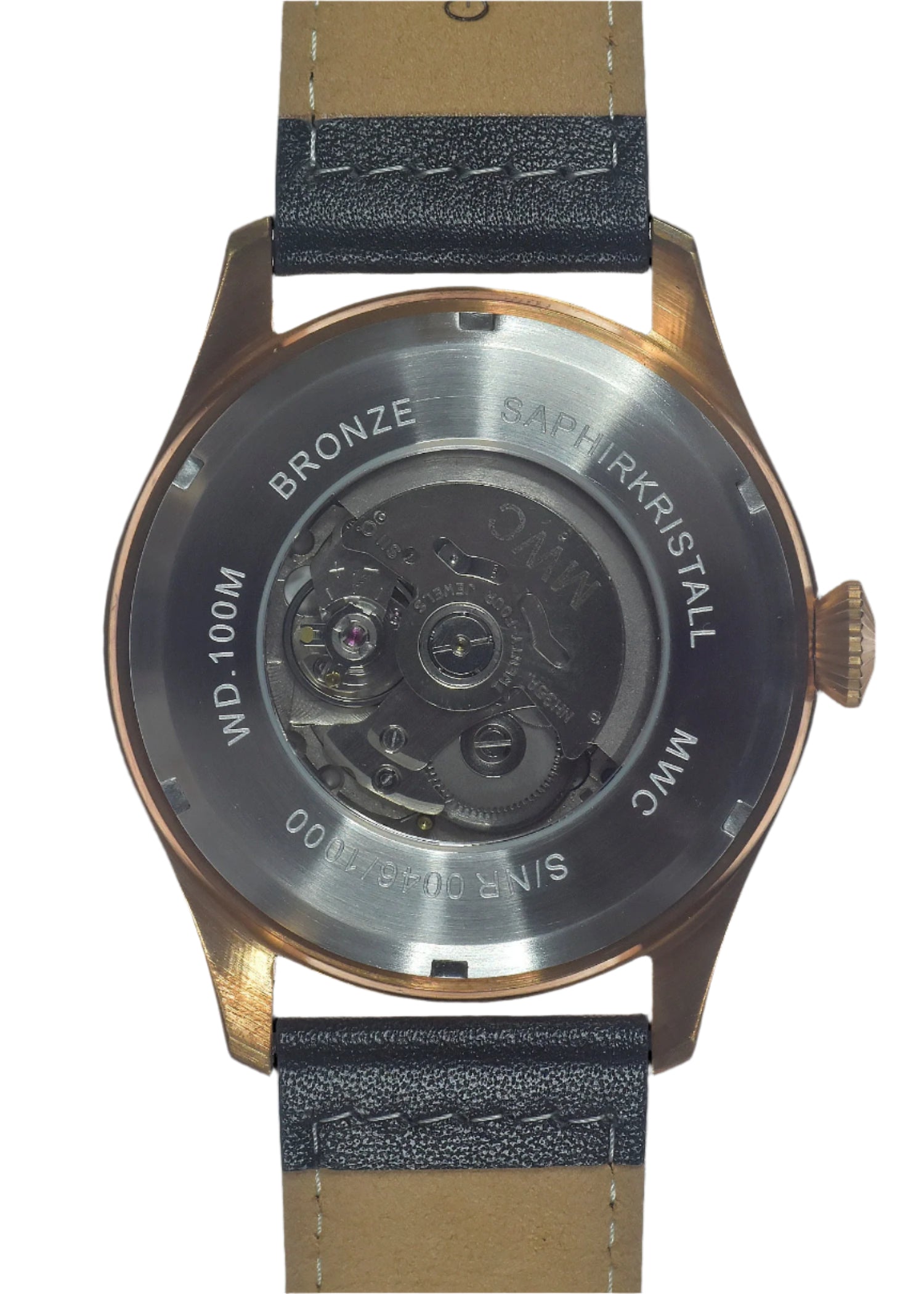 This MWC Limited Edition Bronze Classic Aviator is one of MWC's most distinctive pilot watch models. Crafted from bronze—a blend of copper and tin—it offers a striking alternative to our usual stainless steel and titanium cases. One of bronze’s most fascinating characteristics is how it develops a unique patina over time. While every watch starts out identical, each evolves its own individual appearance, meaning no two watches will ever look exactly the same. This natural aging process not only enhances durability but also gives the watch a one-of-a-kind vintage charm. Remarkably, bronze is also highly resistant to corrosion—even from saltwater and brine.