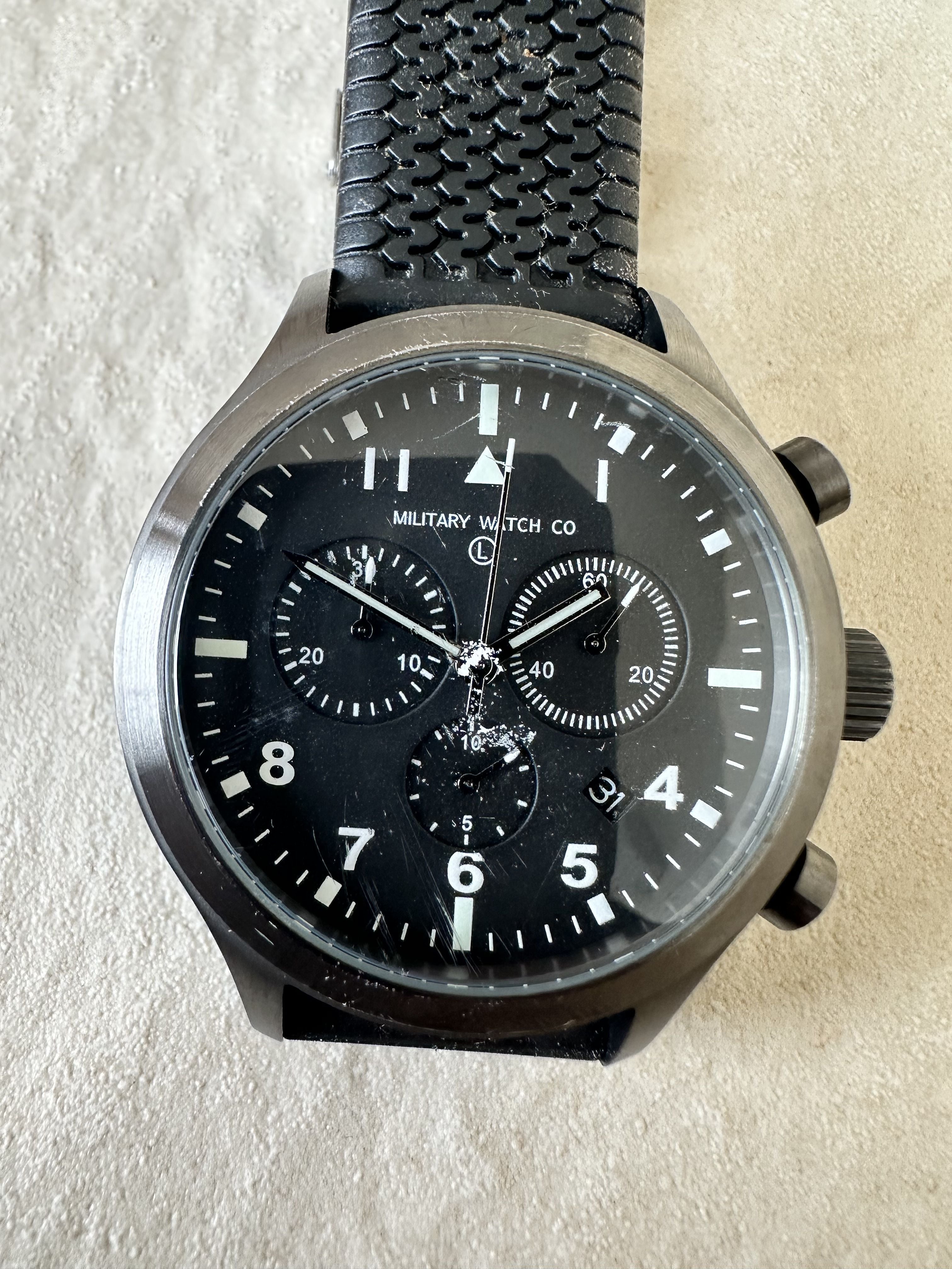 This watch is in clean condition but has experienced an impact on the crystal at some point. It features a Ronda 5040.D movement, which uses a widely available battery. The watch is not currently running but it is 12 years old so that would be expected in all probability. The primary issue is simply the battery but we haven't checked it so cannot be 100% sure.